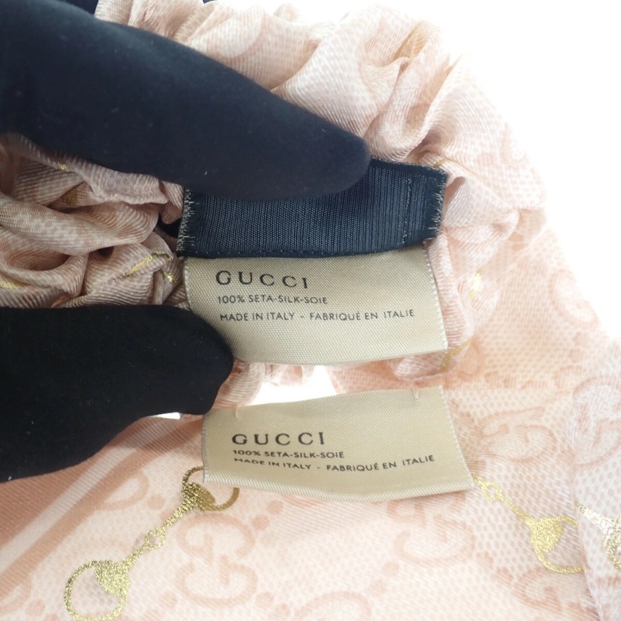 シルクの優しい肌触りにピンク&アイボリーのGGパターンが施されたフェミニンなアイテム。