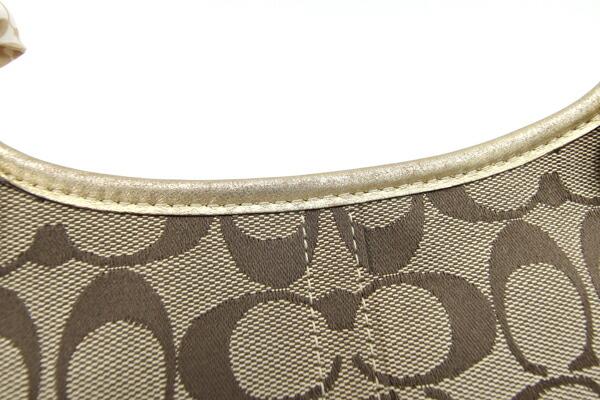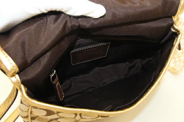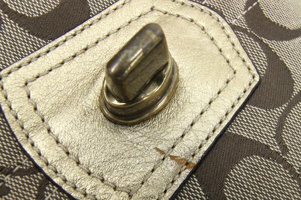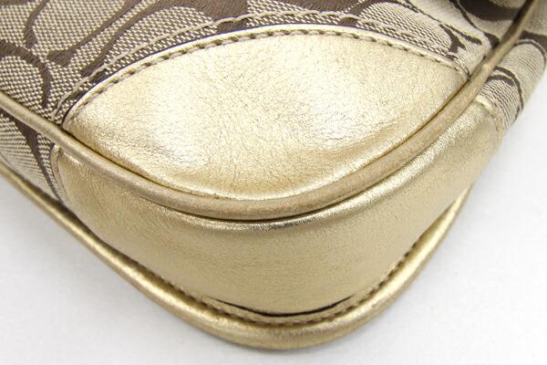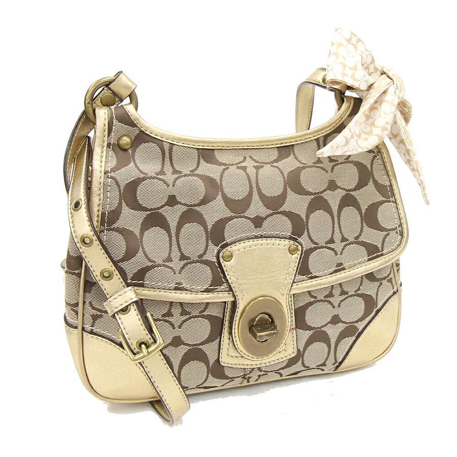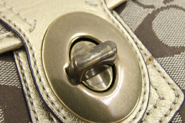 コーチショルダーバッグシグネチャーベージュゴールドキャンバスレザー中古ミニ斜め掛けポシェットターンロックレディース女性婦人COACH