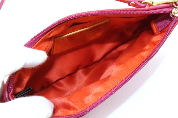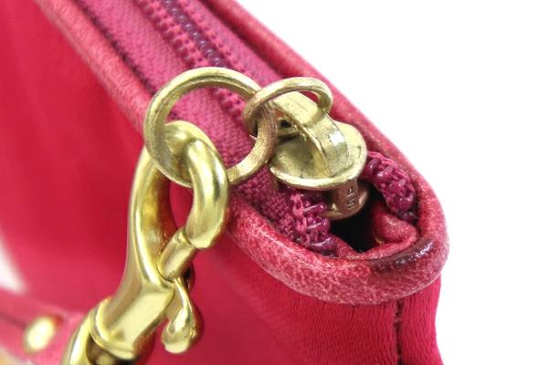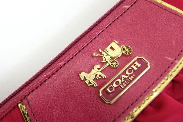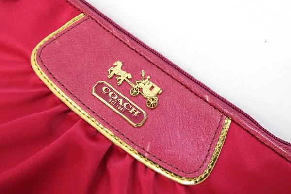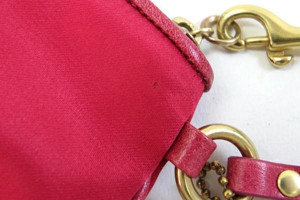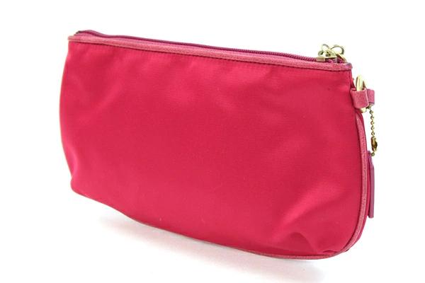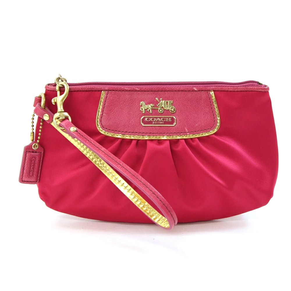 Pre-owned Coach Amanda Pouch 42032 in magenta pink satin and leather with a wristlet logo and strap. Women's accessory pouch.