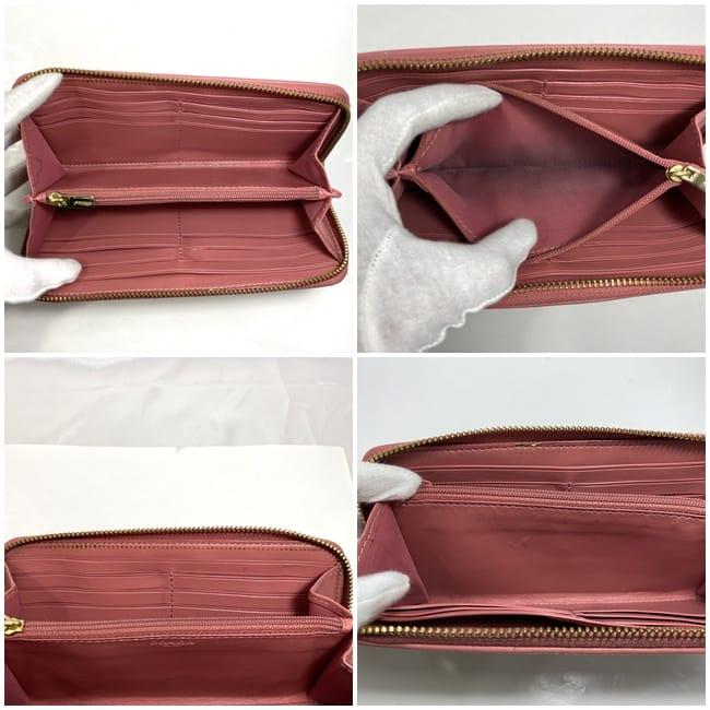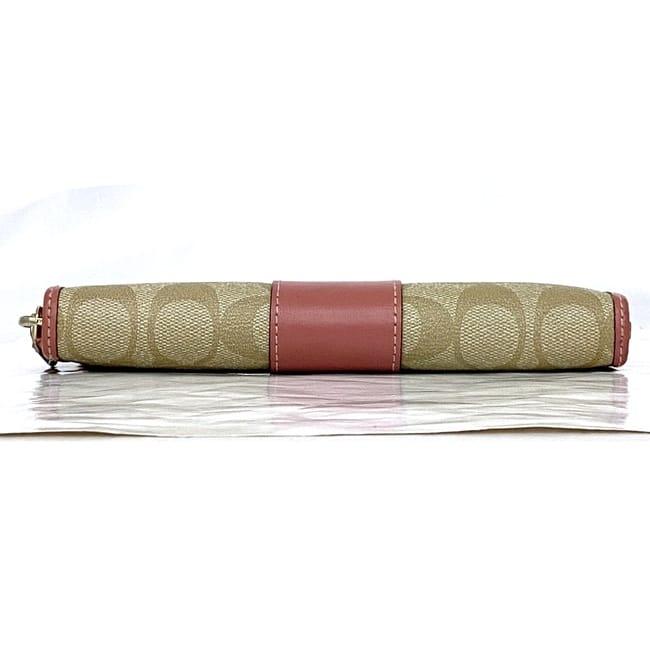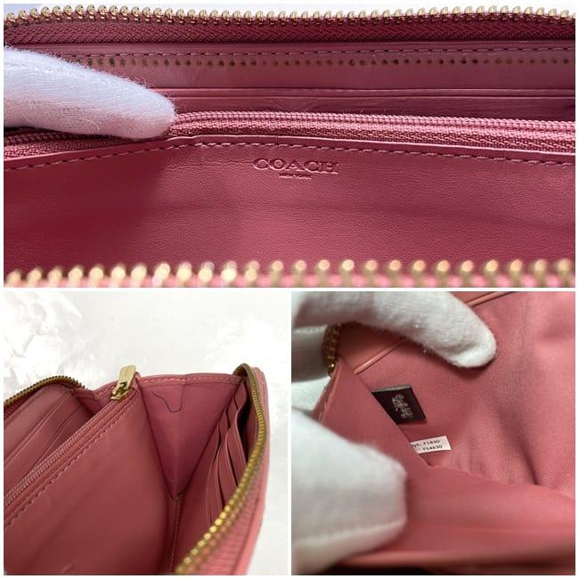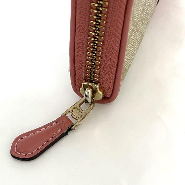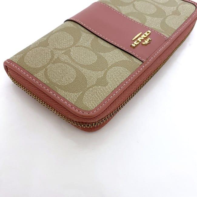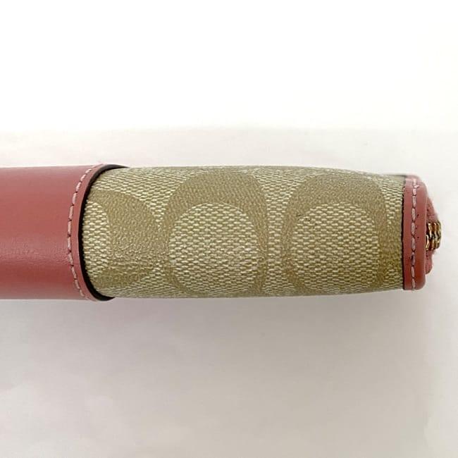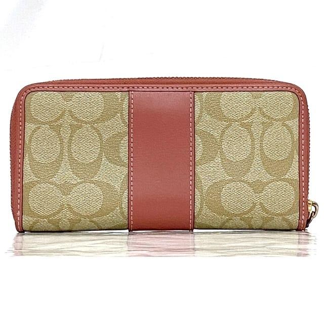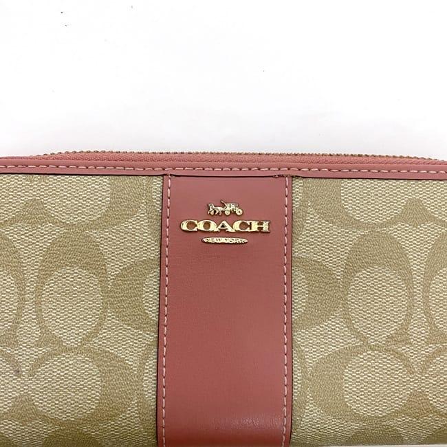 コーチ ラウンドファスナー 長財布 ec-22516 ベージュ ピンク シグネチャー F54630 美品 財布 PVC レザー 中古 COACH ファスナー ロゴ ストライプ 定番 人気 レディース 小物 お洒落 革 ロング ウォレット エレガント 柄 高級感 上品 ブランド 本物 鑑定済み