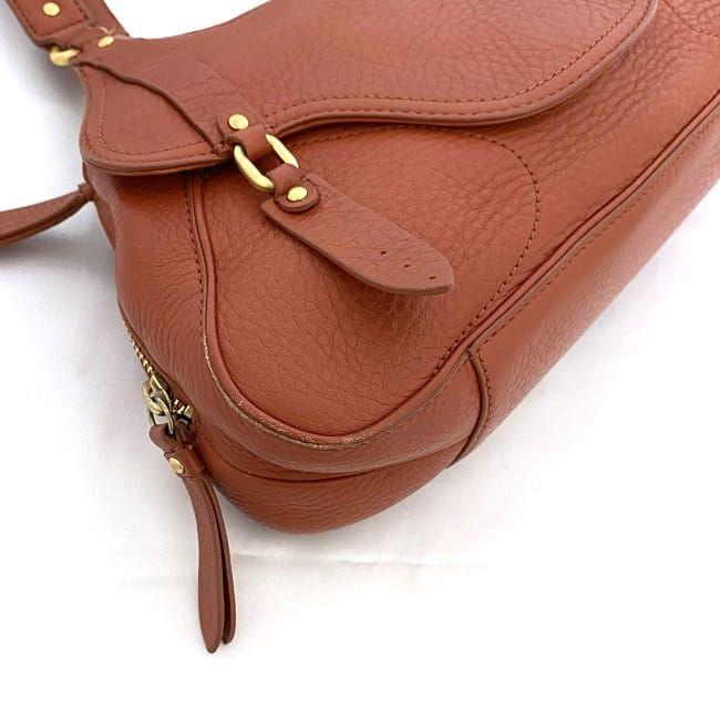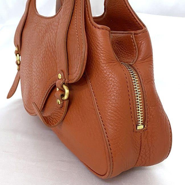 詳細説明:底部の角に擦れ、ハンドルのコバにひび割れ、金具に傷、内底に点汚れ、背面のフラップのベルトに小さな汚れ有、多少の使用感はありますが比較的綺麗なお品物です。