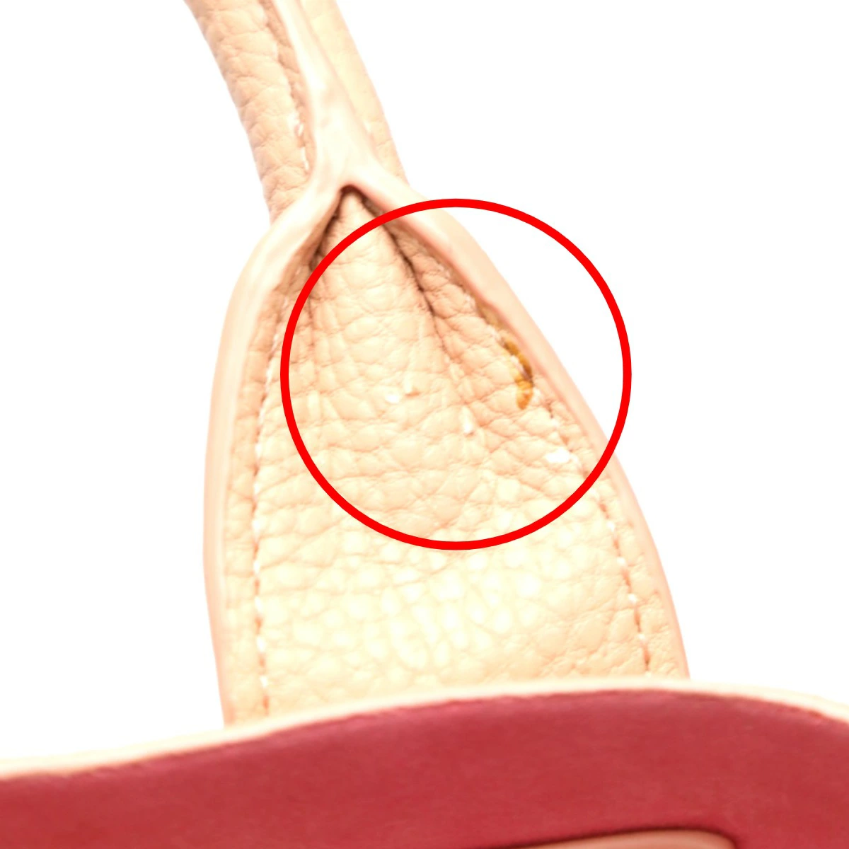| 外側 | ランク:AB 表面:破れ ハンドル・ストラップ:汚れ コーナー:スレ コーナー部分や付近にスレやヒビがあります(画像6,8〜9枚目参照) 表面下にヒビがあります(画像10枚目参照) ハンドル裏側に汚れやヒビ、剥がれがあります(画像12〜14枚目参照) 開け口付近に破れや剥がれがあります(画像15〜16枚目参照) |