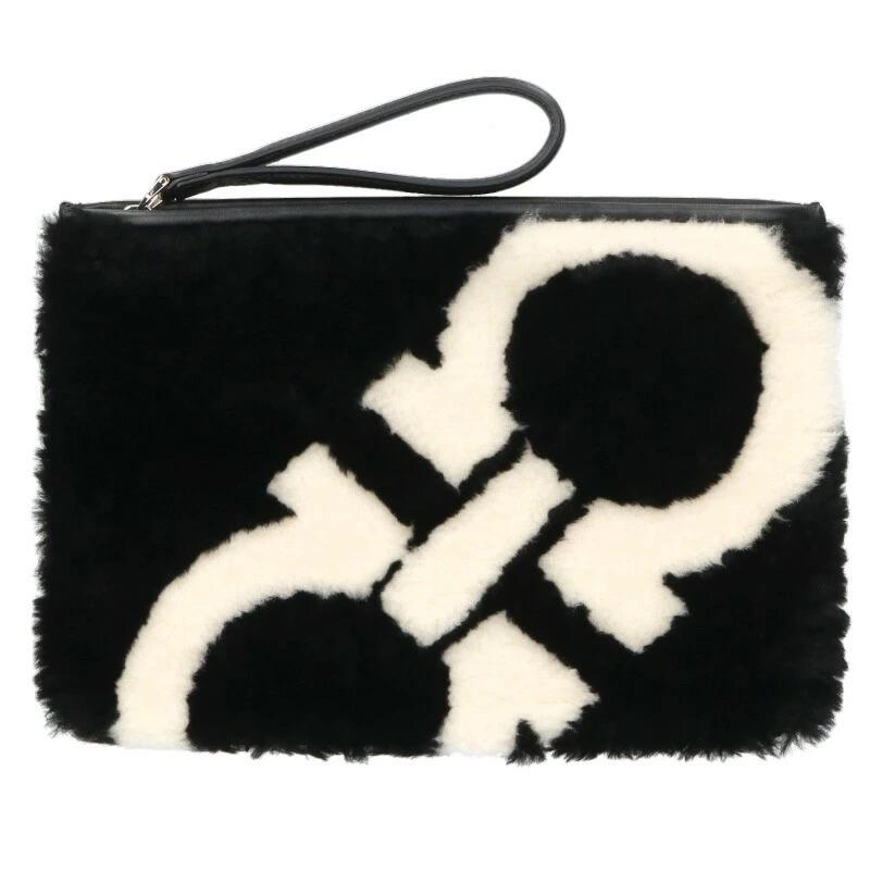 Salvatore Ferragamo GG-24A013 Switch Boa Leather Clutch Bag (Black and White) [907052] [BS99] [Accessory] [Pre-owned] bb377#rinkan*B