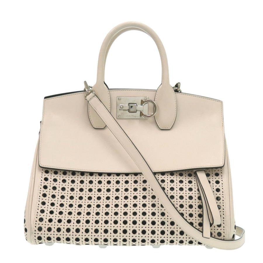 [管理番号]7F0113EI5NB[ブランド]サルヴァトーレフェラガモ(Salvatore Ferragamo)[型番]AU-21/H692[対象]レディース[カラー]ベージュ[金具]シルバー[モデル]ガンチーニ[生産国]イタリア[サイズ]W約28cm x H約23cm x D約14cmハンドル:約25cmショルダー:約93-115cmポーチ横24cm/縦15cm[素材]レザー[仕様]開閉式:ターンロック外側:ファスナーポケット x 1[付属品]ショルダーストラップ ポーチ