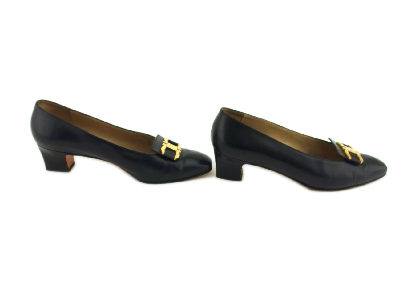 [24% OFF Coupon] Salvatore Ferragamo Gancini #5D Square Toe Pumps, Navy and Gold, Men's, Pre-owned