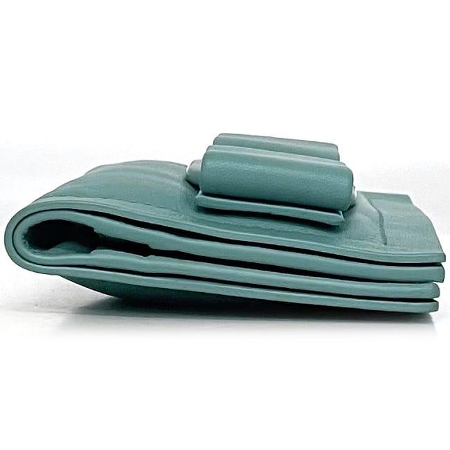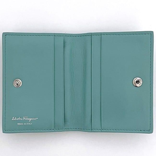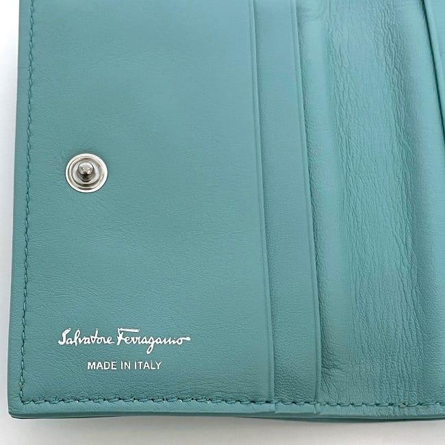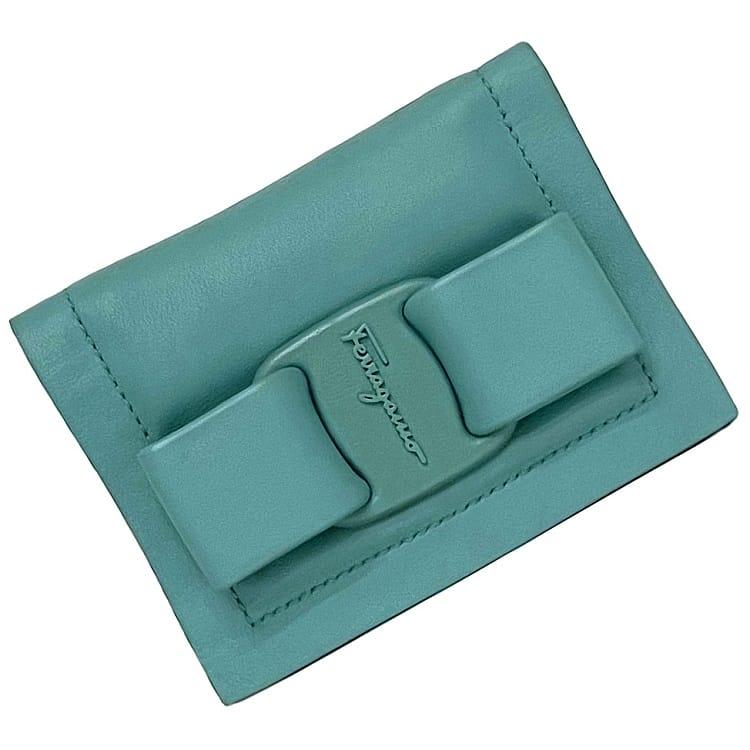 サルヴァトーレ フェラガモ カードケース ec-23099 ターコイズブルー タイロンターコイズ ヴィヴァ ボウ ヴァラ 220295 美品 名刺入れ レザー 中古 JL-22 0295 Salvatore Ferragamo リボン 青 パファー ビバ ホック カード ホルダー ブランド 本物 鑑定済み