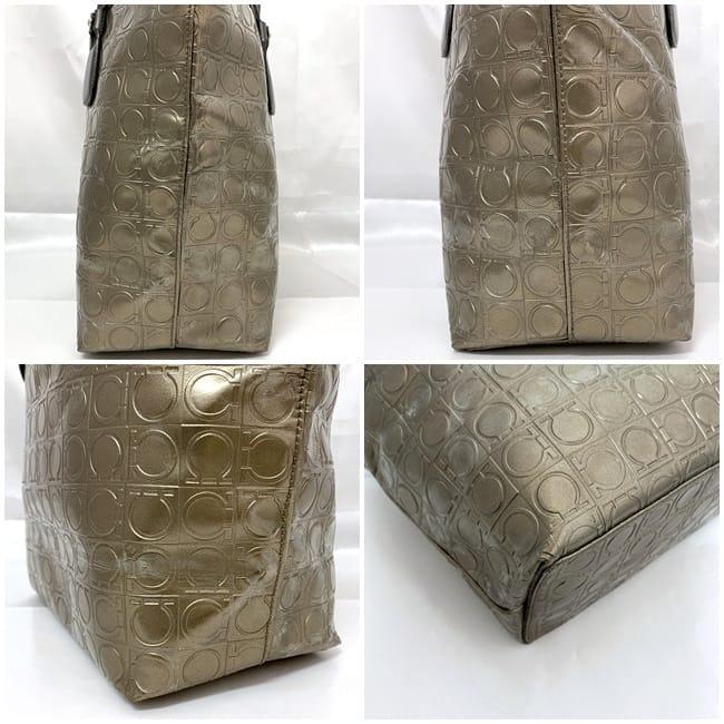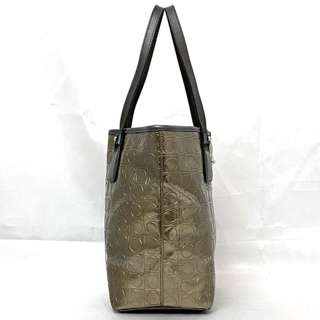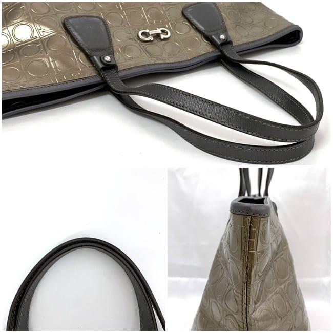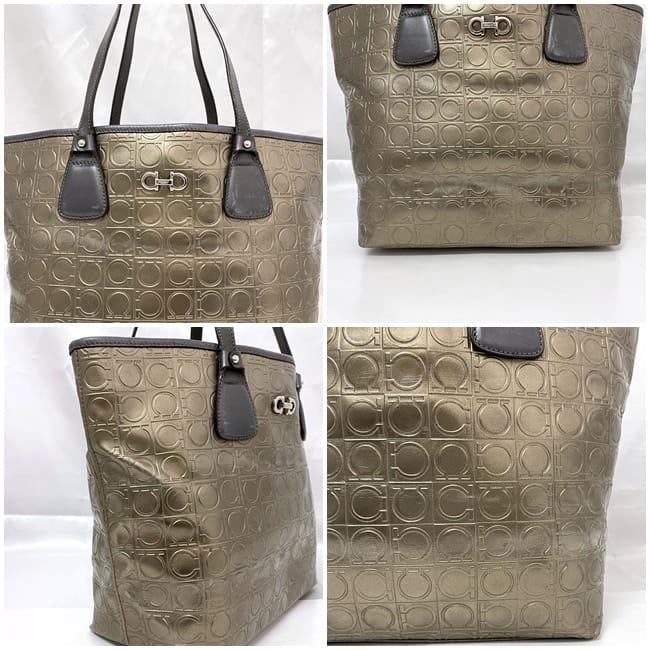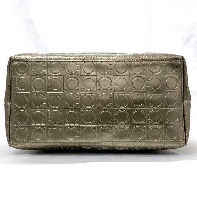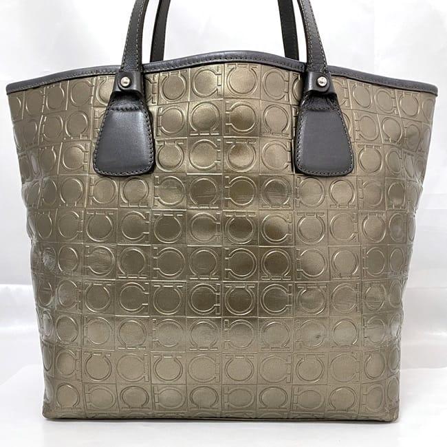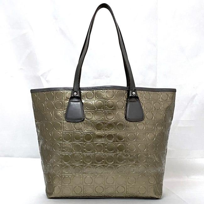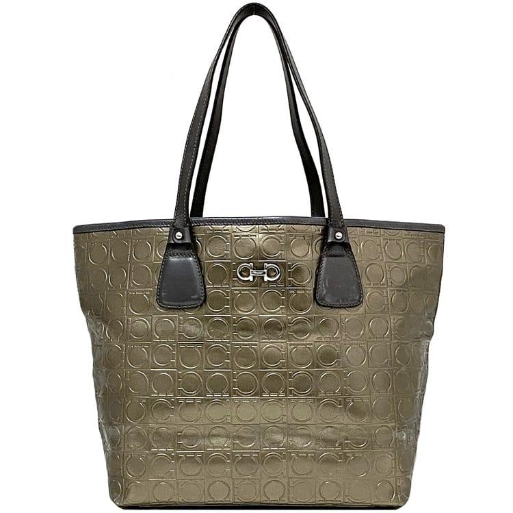 サルヴァトーレ フェラガモ トートバッグ ec-22335 ゴールド グレー ガンチーニ 美品 PVC レザー 中古 FJ-21 B476 Salvatore Ferragamo 肩掛け 総柄 マグネットヴィンテージ ロゴ 定番 人気 お洒落 革 トート バッグ 鞄 灰色 エレガント ブランド 本物 鑑定済み