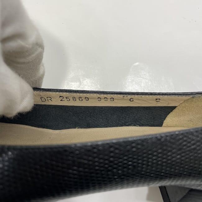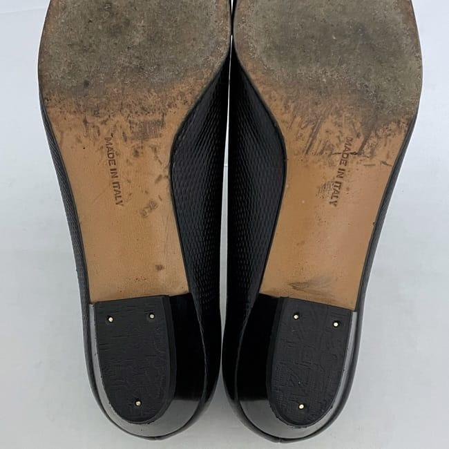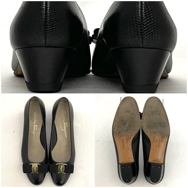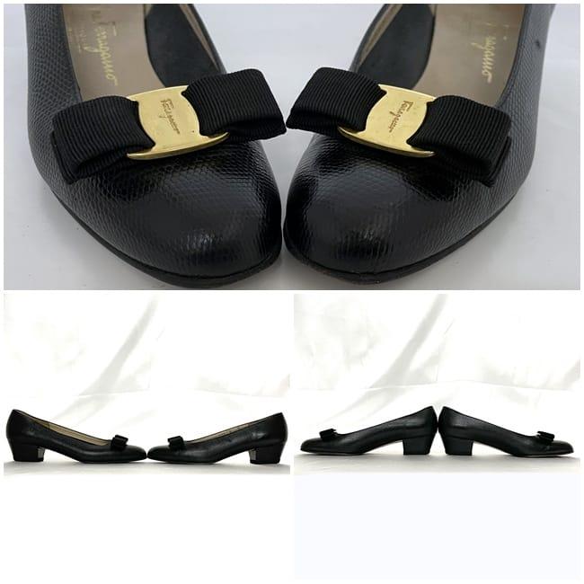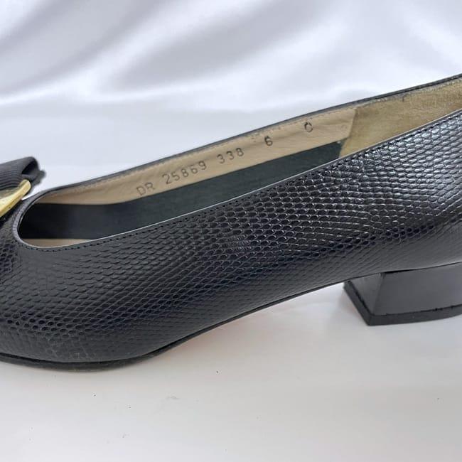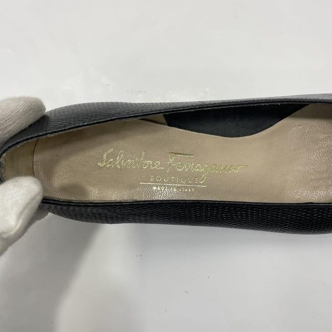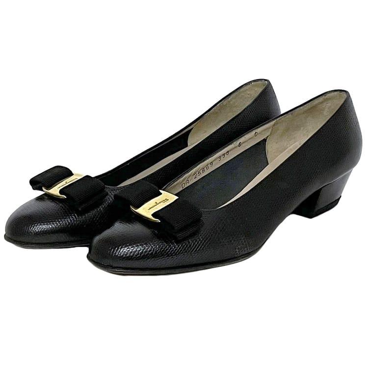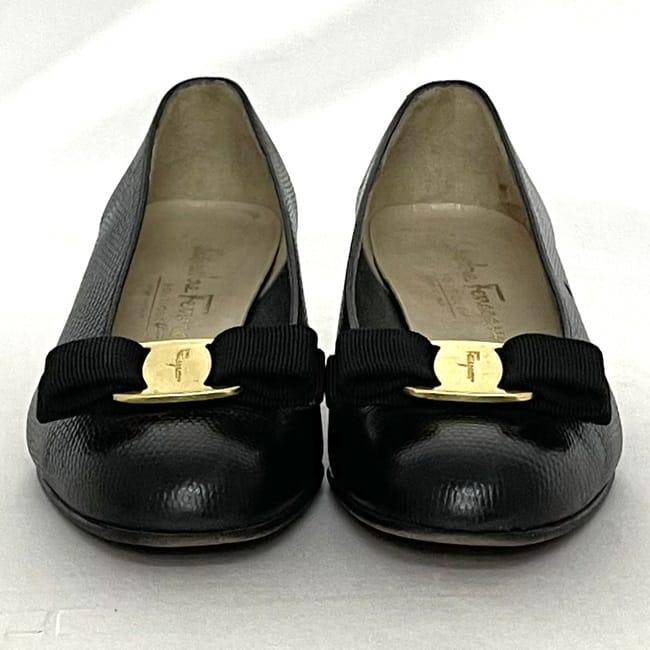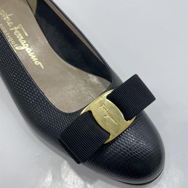 サルヴァトーレ フェラガモ パンプス ec-22733 ブラック ゴールド ヴァラ 美品 23.5cm レザー 中古 Salvatore Ferragamo ヴィンテージ アパレル 靴 ヒール ローヒール レディース シューズ リボン ロゴ リザード風 シンプル お洒落 上品 ブランド 本物 鑑定済み