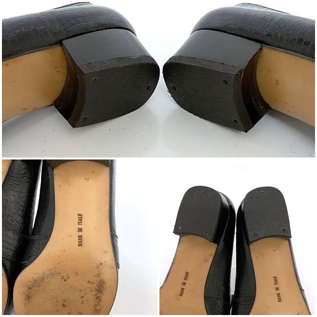 詳細説明 | ヒール底社外品に交換済み。金具に小傷、つま先・かかと・ヒールに擦れや傷、内側に汚れやロゴ擦れ、靴底に使用感がございますが比較的綺麗なお品物です。 |