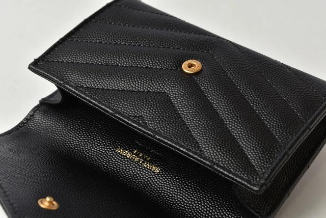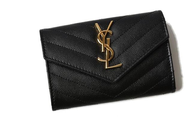 サンローランより、スナップ式の財布/カードケースです。傷、汚れの目立ちにくい型押しレザー素材です。センターには、YSLのロゴがデザインされており存在感があります。内側は、ポケットが充実しており、機能的です!カードポケットが4枚もあります。