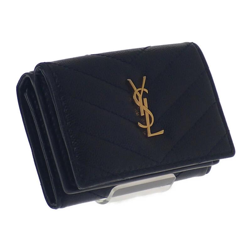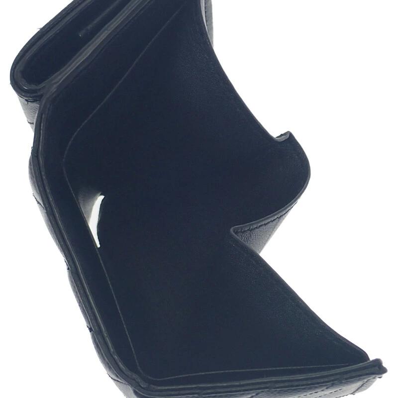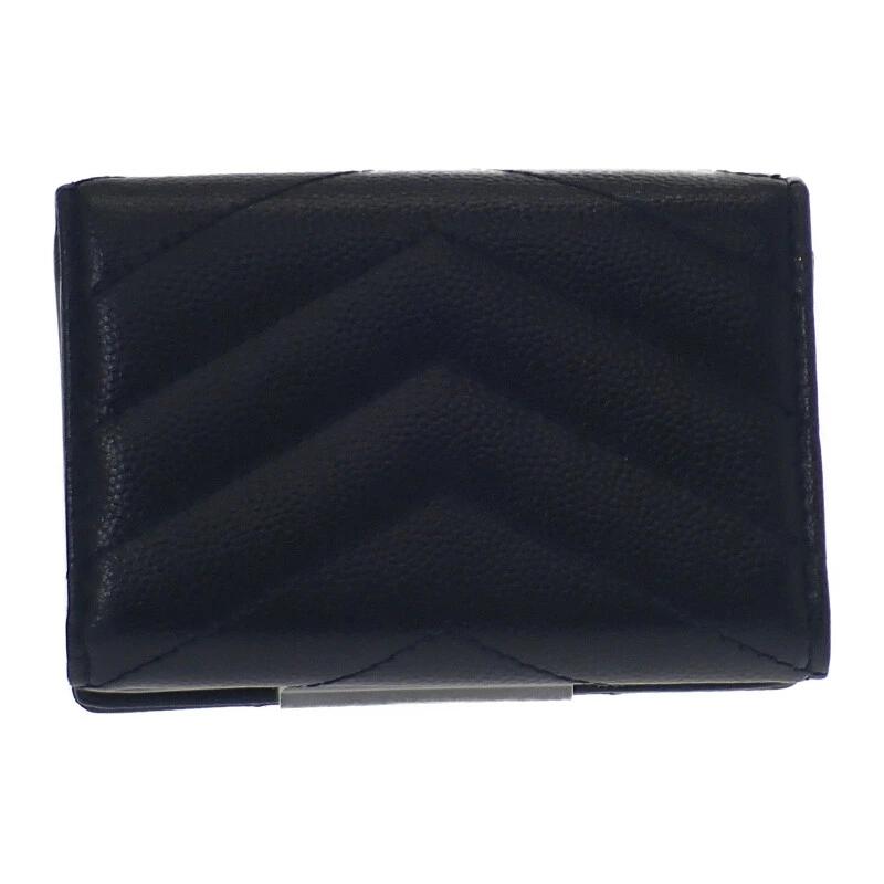 上質なブラックカーフスキンに、シャープな折り紙を彷彿とさせる立体的なフォルムが特徴。フロントに配されたゴールドのYSLメタルロゴが、シンプルな中にもラグジュアリーな存在感を放ちます。手のひらにすっぽり収まるミニサイズながら、札入れ・カードスロット・コインポケットを備えた機能性も充実。コンパクトバッグやクラッチにも収まりやすく、デザイン性と実用性のバランスが絶妙な逸品です。