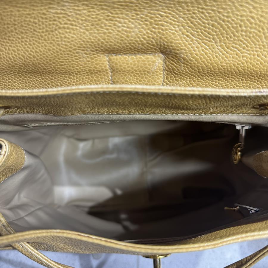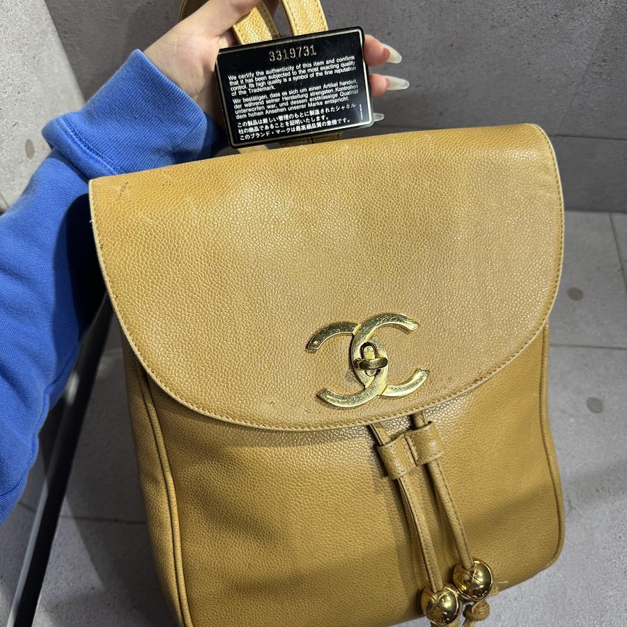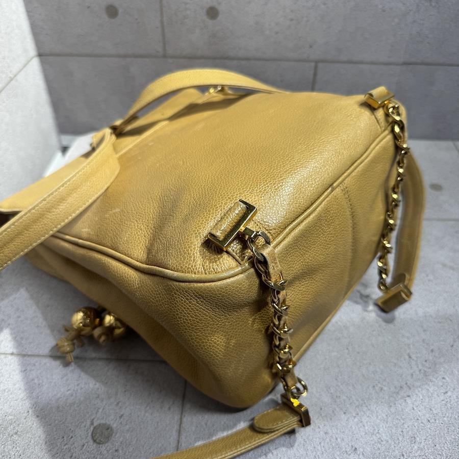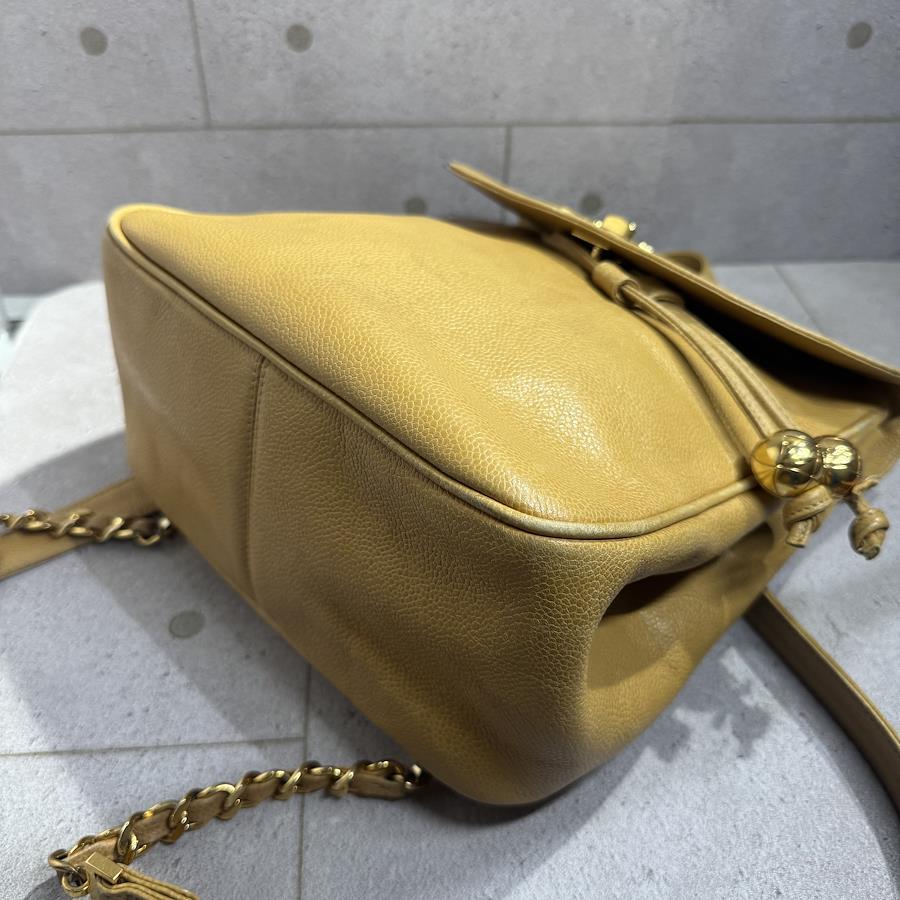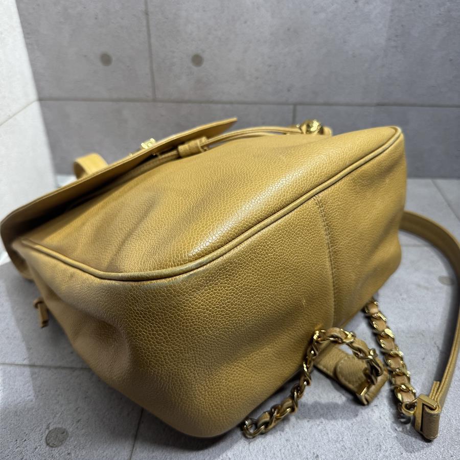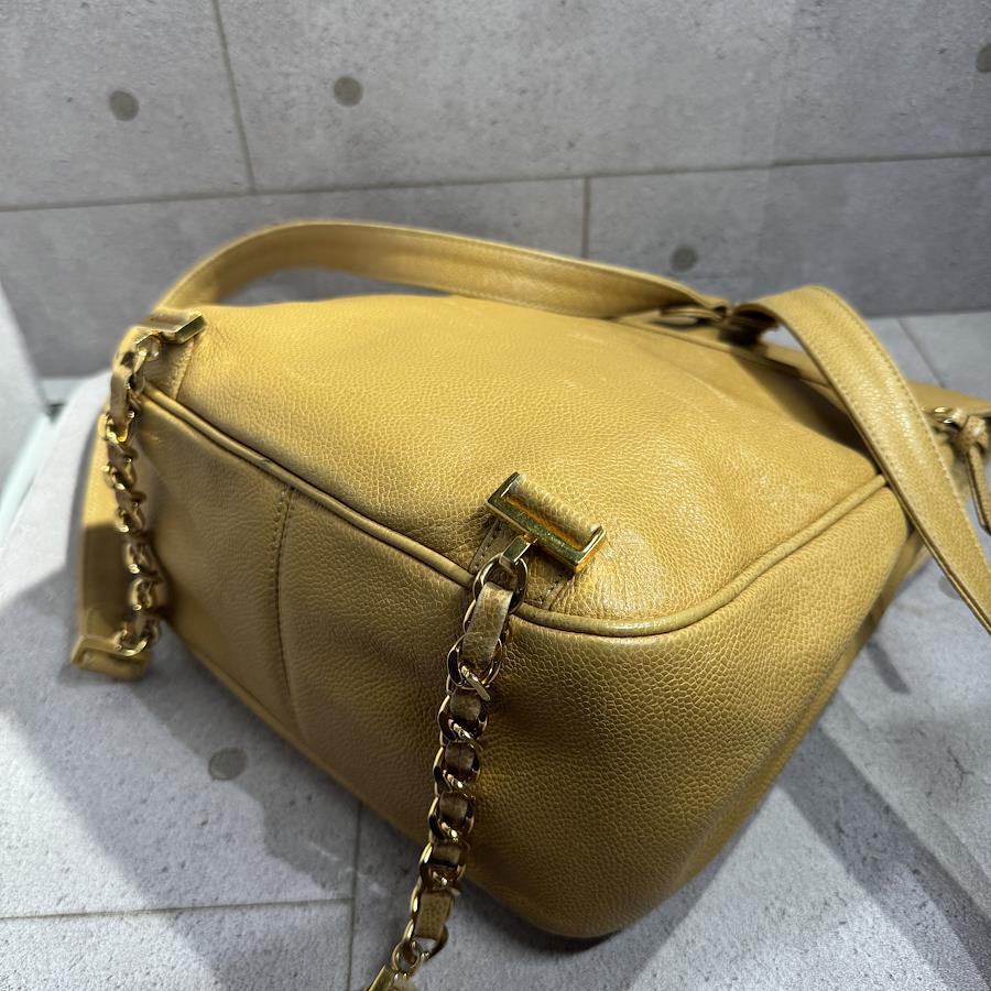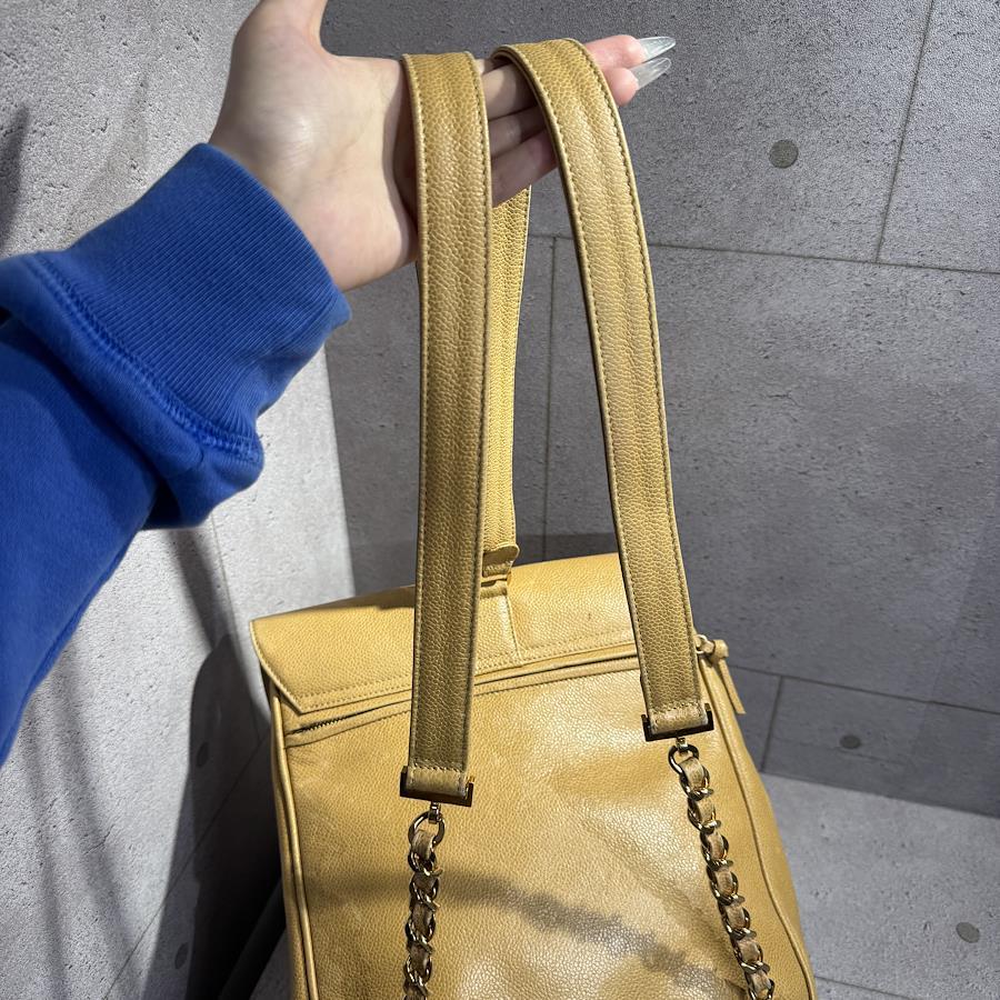 ブランド名:シャネル素材:キャビアスキンサイズ:約 H 30cm×W 30cm×D 11cmチェーン長さ:約 80cm年代:3番台 1994年ー1996年製造付属品:ギャランティカード、シリアルシール状態:Bランク 使用感のある中古品