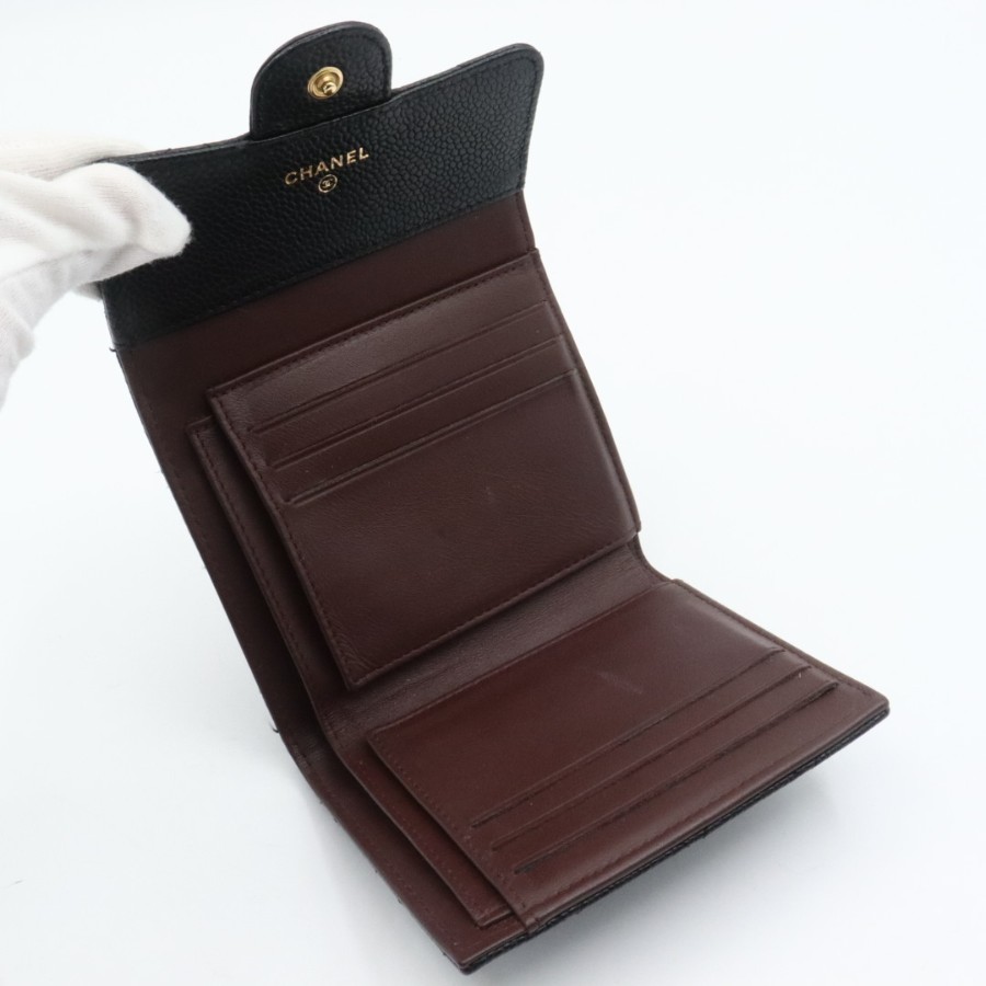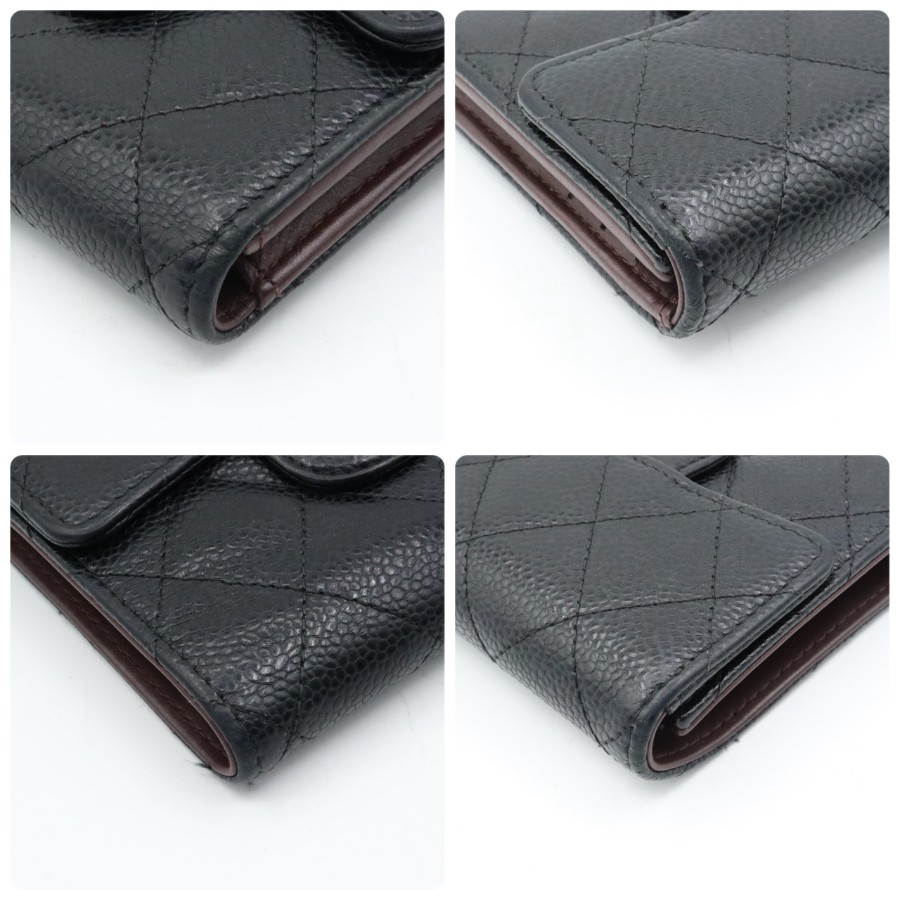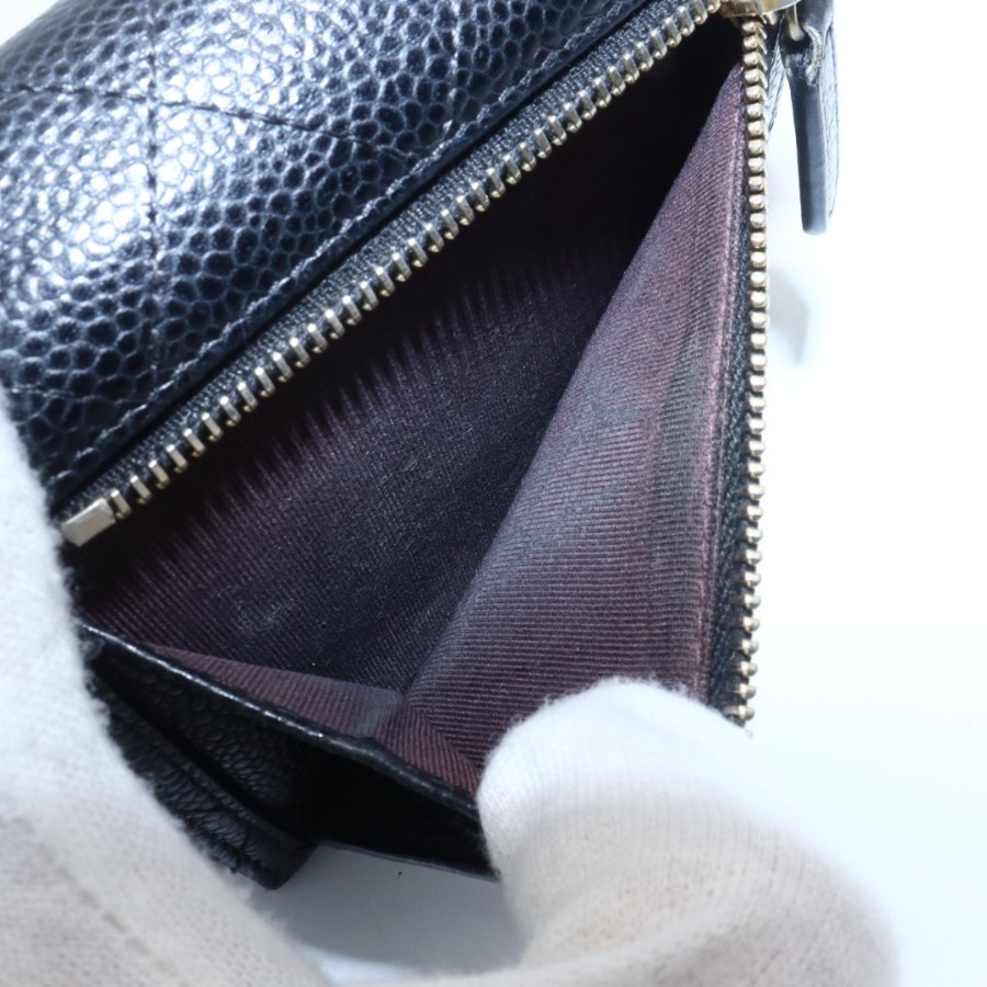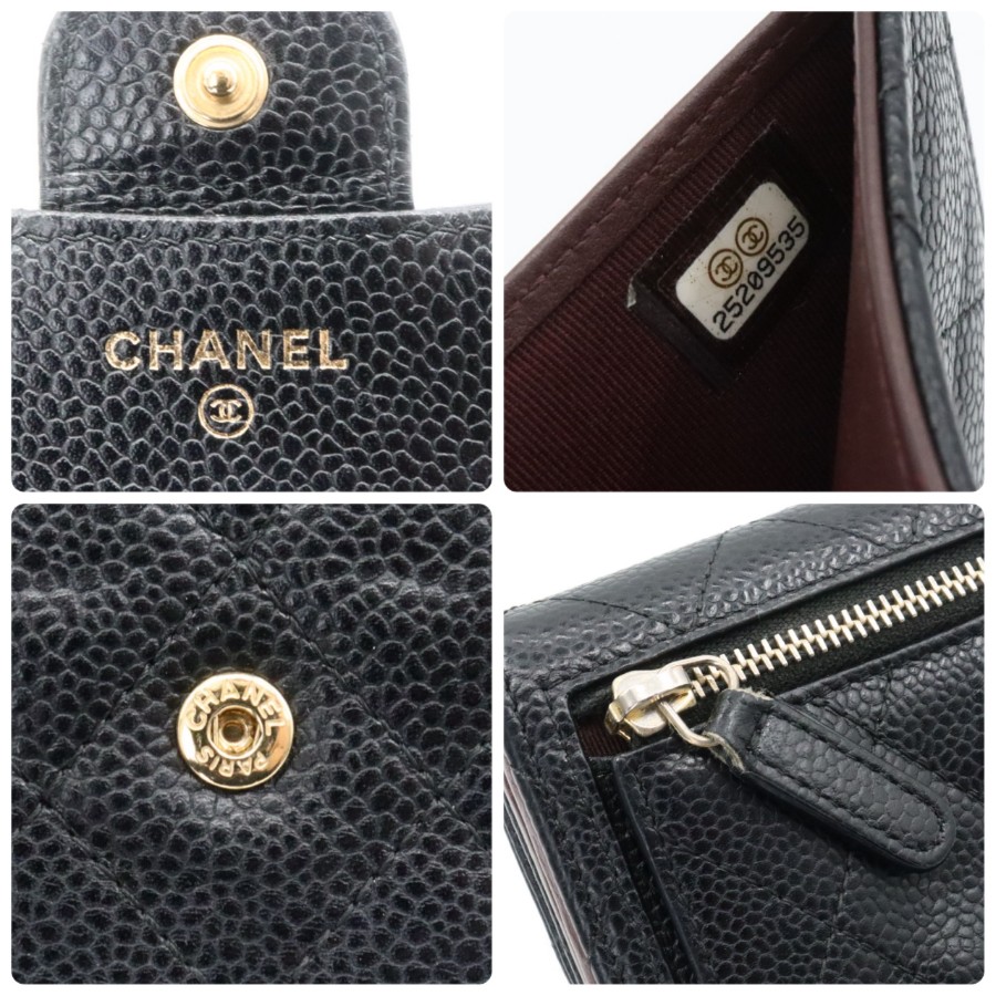 【商品説明】品名 シャネル キャビアスキン マトラッセ 折り財布 ブラックシリアルナンバー 25209535サイズ 約縦10センチ 横11.5センチ 厚み3センチ仕様 小銭入れ1 札入れ1 ポケット2 カード入れ6付属品 なし【商品状態】剥がれ、ベタつきありません。ファスナースムーズです。ボタンしっかりとまります。若干のスレ、ヨレがあります。届いたらすぐに気持ちよくお使いいただけるコンディションです。この機会に是非お買い求めください