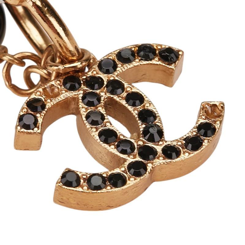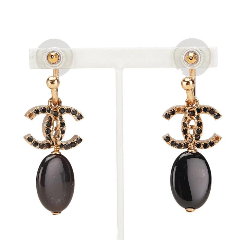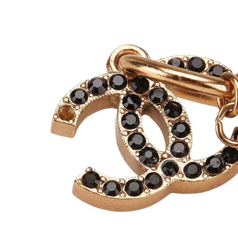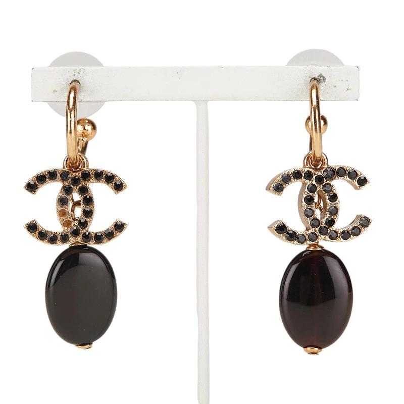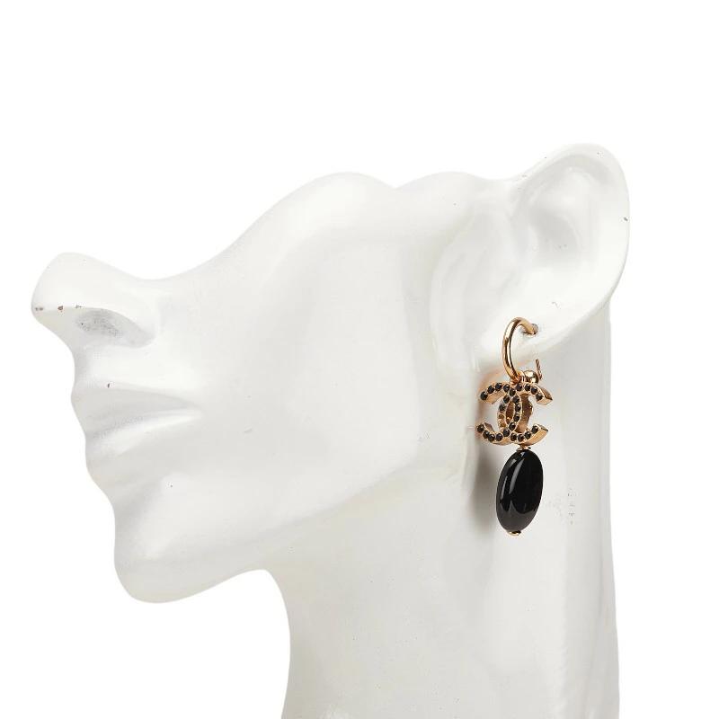 Pre-owned Chanel Coco Mark Rhinestone Swing Hoop Earrings, Gold and Black Plated, Women's.