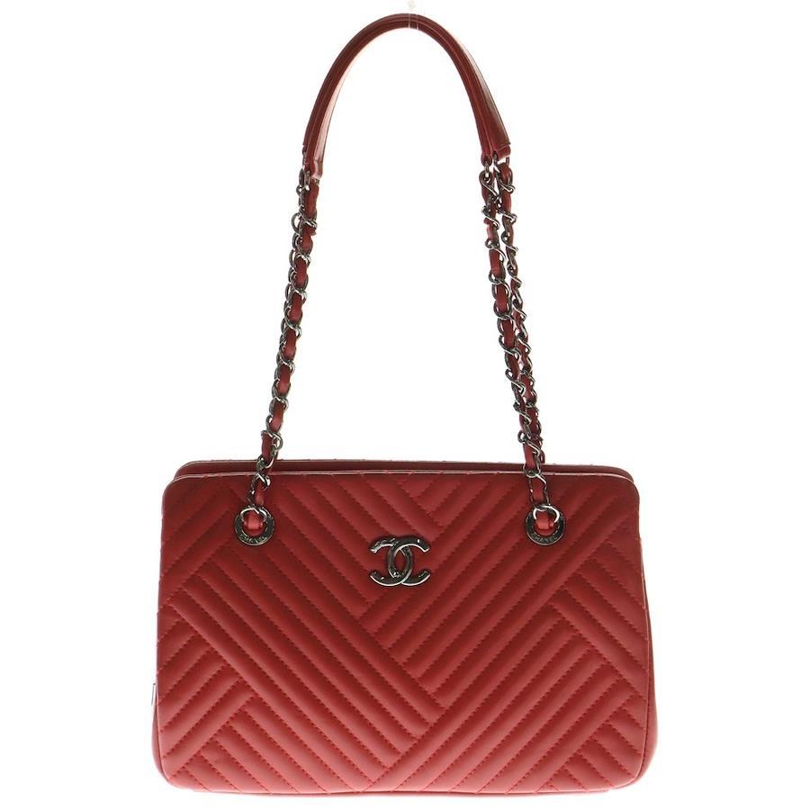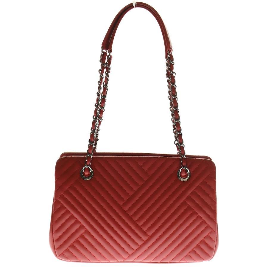 [モデル]チェーンショルダーバッグ ハンドバッグ レッド ココマーク ラムスキン Vステッチ シルバー金具