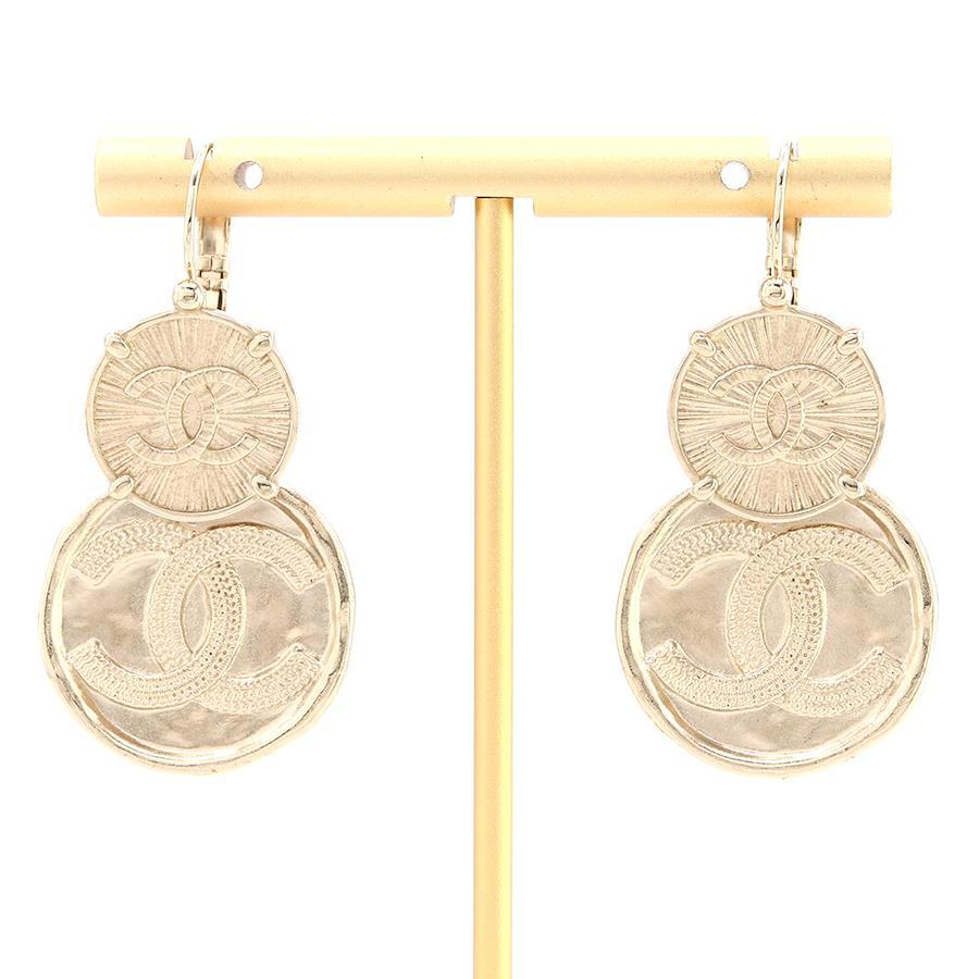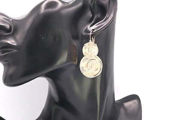シャネルピアスダブルメダリオンピアスマットシャンパンゴールドメタルA22P2022年モデル中古ラウンドココマークイヤーアクセサリーレディースメダル金貨CHANEL