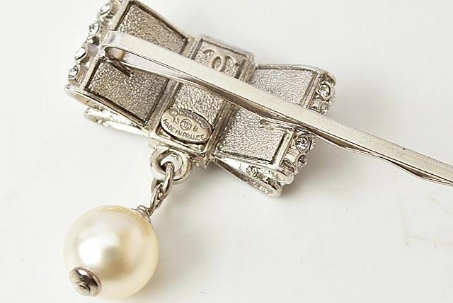 CHANEL リボンモチーフ ラインストーン/フェイクパール シルバー