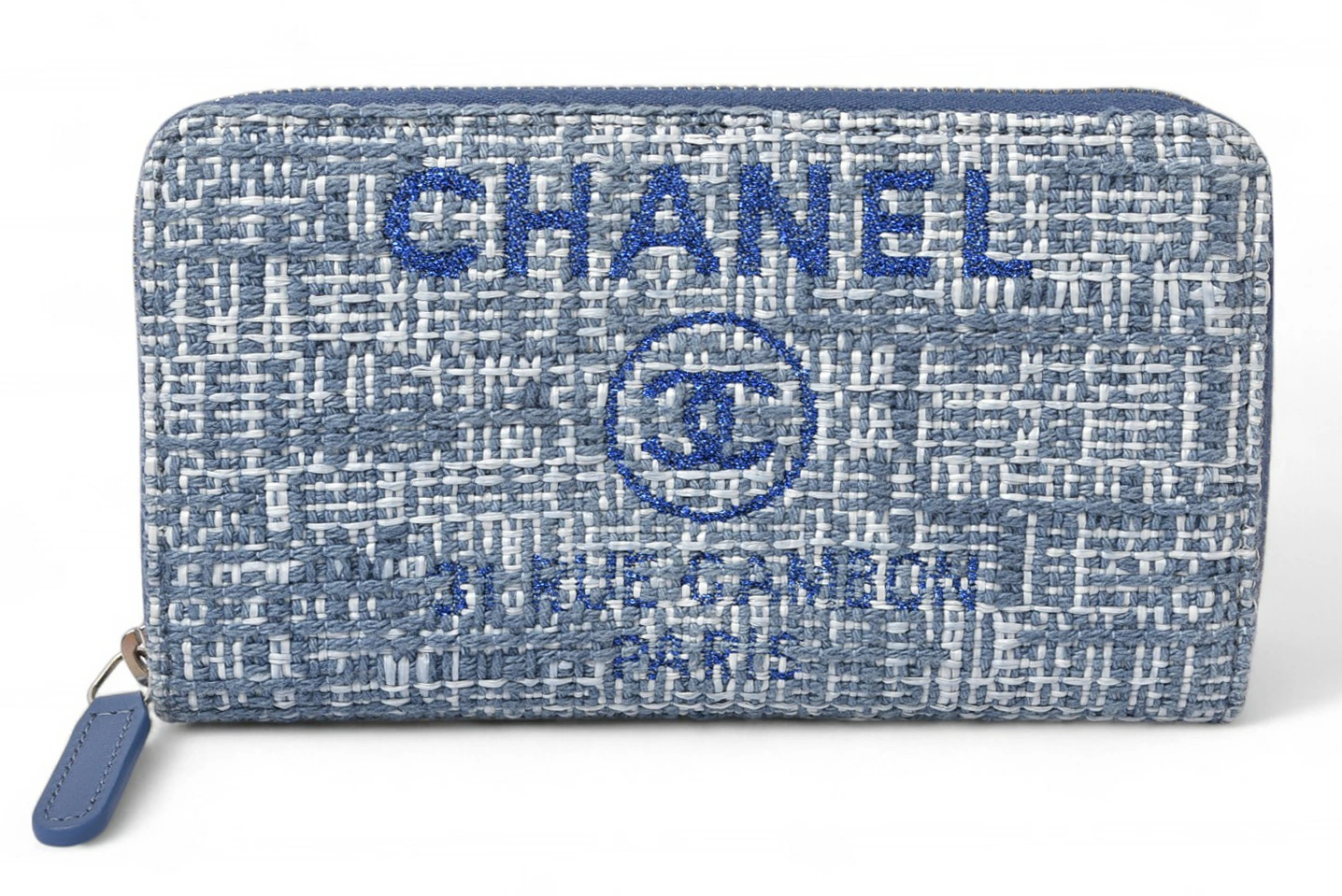 商品説明 | シャネルより、ラウンドファスナーのミディアムウォレットです。コンパクトサイズで、小ぶりなバッグにも収納が可能です。国内直営店でも完売となり、既に入手困難品となってしまったドーヴィルラインの財布です。センターに、ココマークとロゴが織り込まれ、キャンバス地ですので、カジュアルな服装にも合わせやすいです。お札は、折って収納するミディアムサイズです。 |