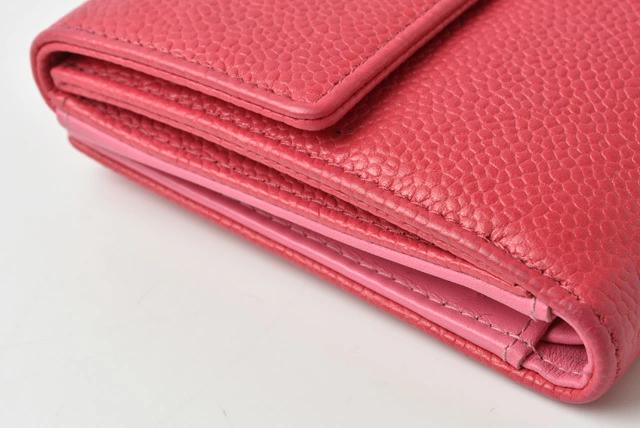 シャネルより、人気のキャビアスキン、ダブルホック式のお財布です。バイカラーになっているボタンがとってもアクセント!素材のキャビアスキンは丈夫で傷も付きにくく人気の素材です!コンパクトながらポケットも充実しており、財布の中身が多くなりがちな方も、すっきり整頓できます。