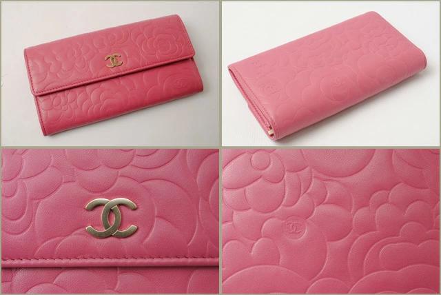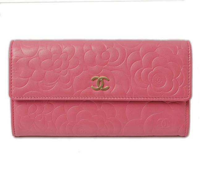 CHANEL 長財布 カメリア 型押し A50084 ラムスキン ピンク/ゴールド金具