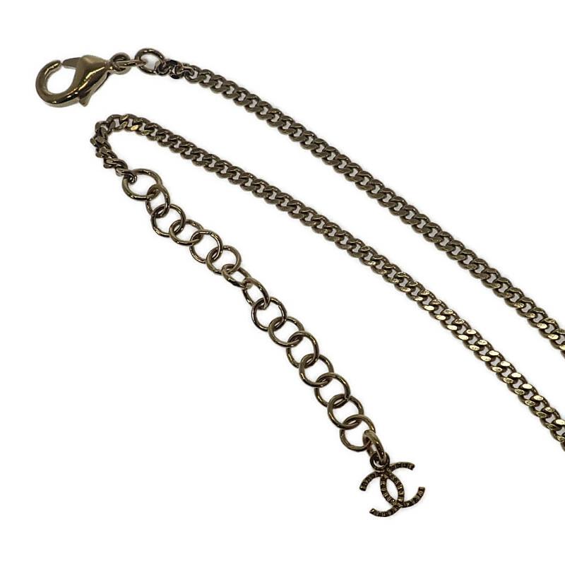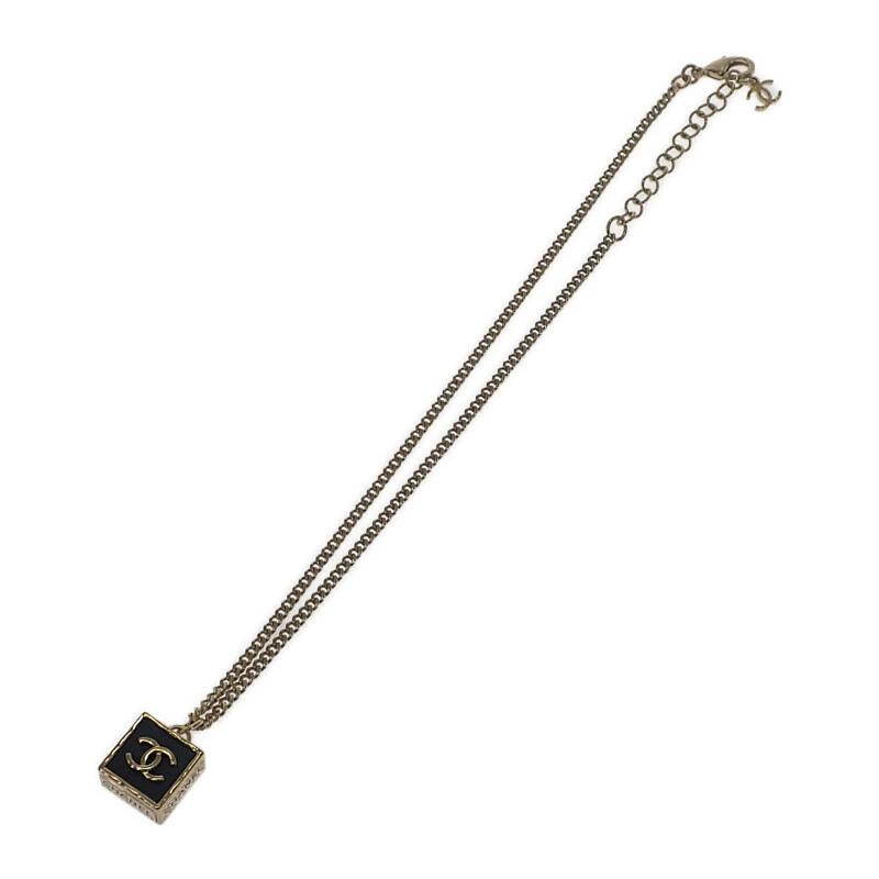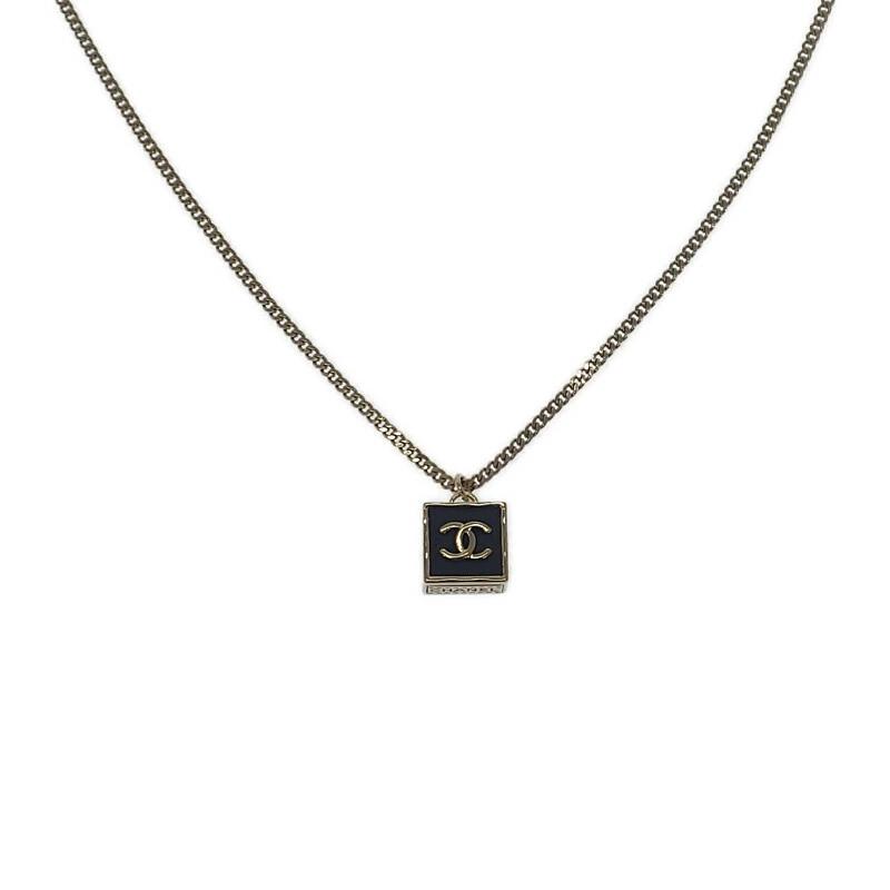メタリックなスクエアチャームにブラックカラーのCCマークが映えるモダンなデザイン。