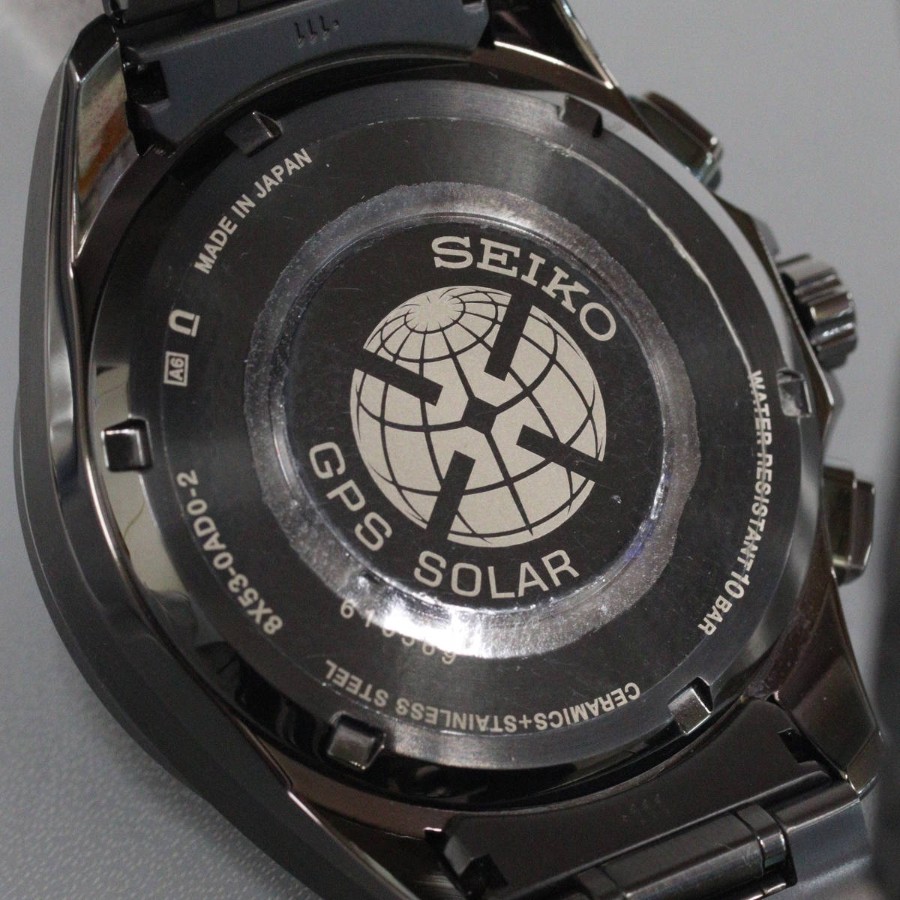 セイコーのメンズウォッチ、アストロン GPSソーラー デュアルタイム(SBXB079)8X53-0AD0の中古品です。ベゼル ラグに傷があります。ケース裏に保護シールが貼られています。ベルトに全体的に使用に伴う傷があります。内箱にべたつきがあり、外箱に破れや汚れなど劣化があります。保証書が付属し、記載の購入日は2017年3月25日です。付属品は以下の通りです。内外箱保証書取扱説明書+---+---+---+---+---+。{状態}ケースABベルトB{素材}ケースセラミック/SSベルトSS{サイズ} ケース:約45mm ,ストラップ:約20.5cm。{ムーブメント}GPSソーラー{その他}176.0g10気圧防水デイデイト表示パワーリザーブ表示 etc...。{付属品}内外箱,保証書,取扱説明書{お問合せ商品番号}26036030+---+---+---+---+---+。