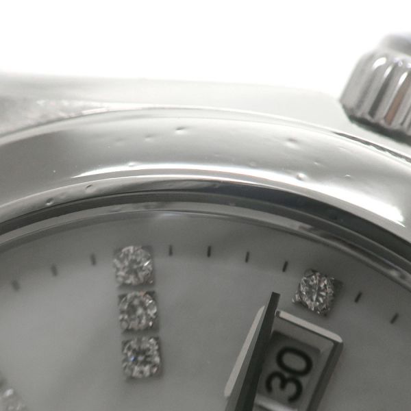 ホワイトパールのダイアルにダイヤ34Pをインデックスに施し華やかな印象です。当社提携の時計修理工房にて外装の仕上げと電池交換を行っております。ベゼルや裏蓋に小キズ、ガラスに擦れがございます。