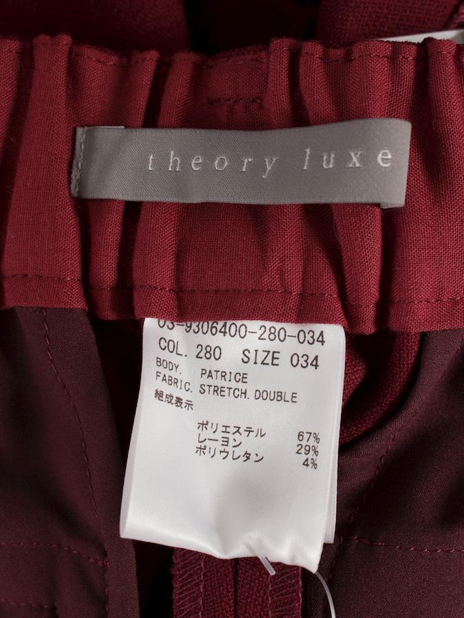 【管理番号】0260784h0238510【ブランド・アイテム】Theory luxe パンツ【性別タイプ】レディース【表記サイズ】34【実寸サイズ】総丈:約94cmウエスト:約64cmヒップ:約82cm股上:約25cm股下:約69cmわたり:約27.5cm裾幅:約15cm伸縮:あり【カラー】レッド / ワインレッド【素材】画像参照【状態の詳細】USED品ではありますが、目立つダメージや大きな汚れのないコンディションのよい美品です。【汚れ・シミ】特に目立つものはございません。【キズ】特に目立つものはございません。【毛玉・毛羽立ち】特に目立つものはございません。【使用感】少ない〜普通 ウエスト部分に少々ハンガー跡がございます。【こんな方におススメ】USED品でも汚れやダメージが少ないお品物をお探しの方にオススメ【付属品】紙タグ、予備ボタン【備考】販売年月:2019型番:9306400参考価格:29000円