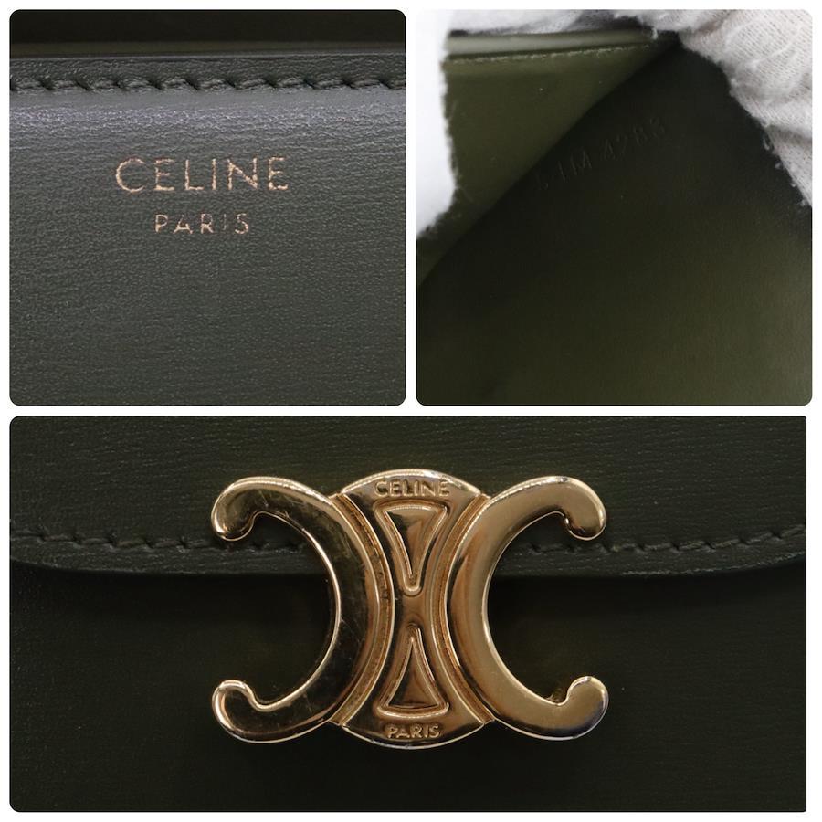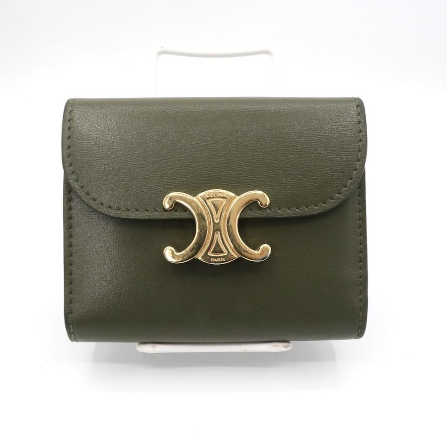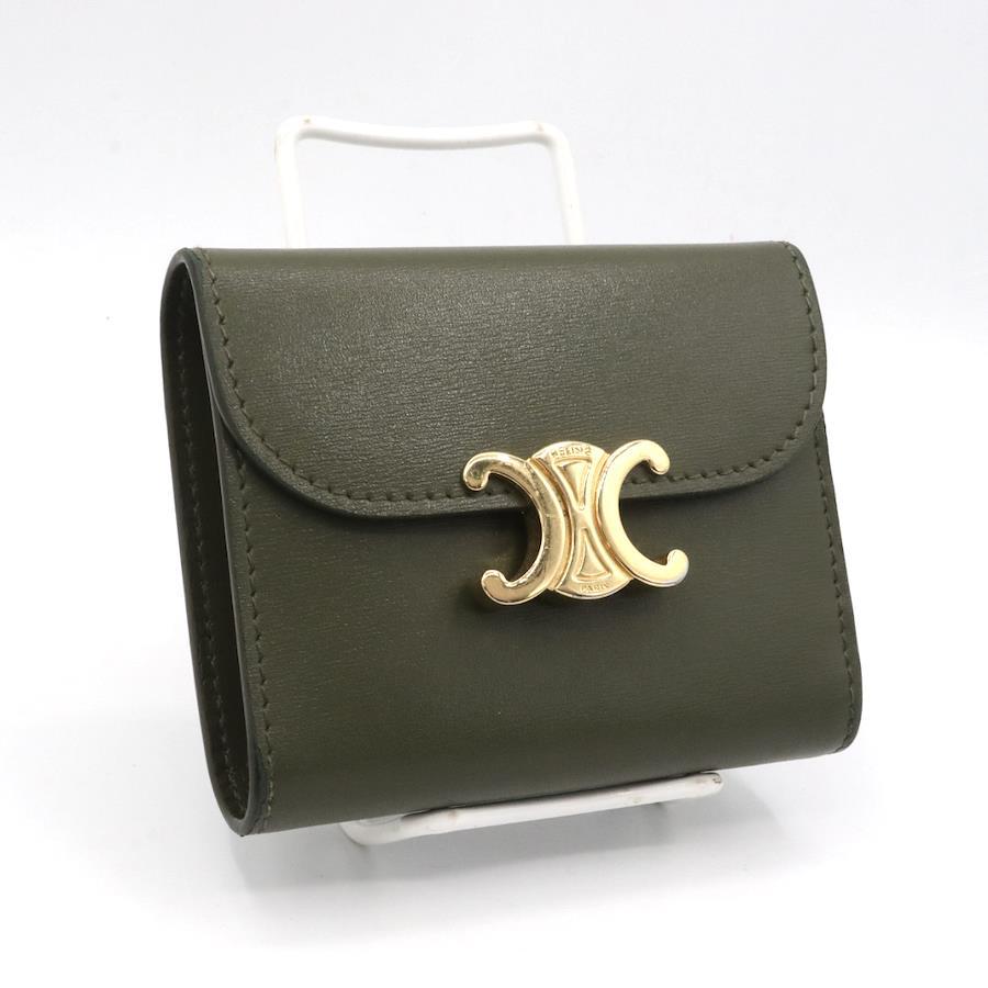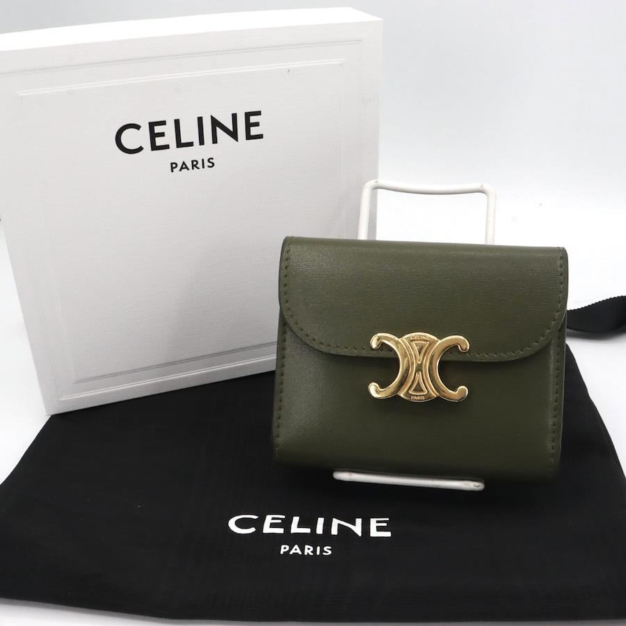 【商品説明】品名 セリーヌ カーフスキン トリオンフ 折り財布 カーキシリアルナンバーサイズ 約縦8.5センチ 横10.5センチ 厚み3センチ仕様 小銭入れ1 札入れ1 ポケット2 カード入れ5付属品 箱 保存袋【商品状態】剥がれ、ベタつきありません。ボタンしっかりとまります。若干のスレ、ヨレがあります。届いたらすぐに気持ちよくお使いいただけるコンディションです。この機会に是非お買い求めください