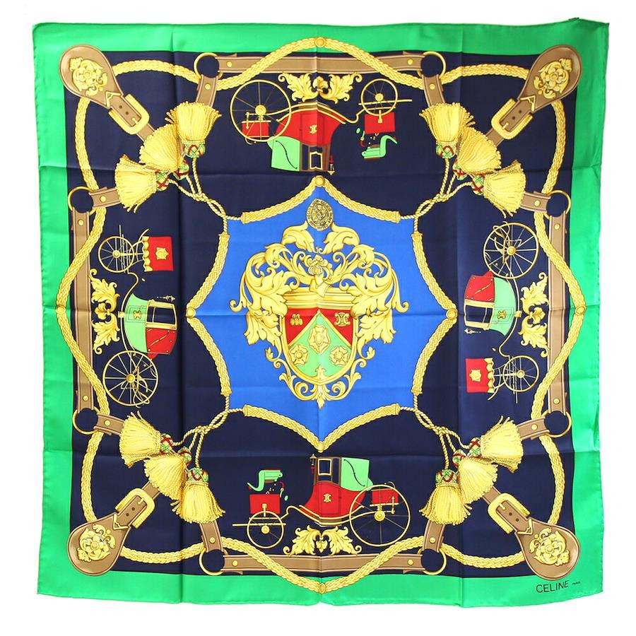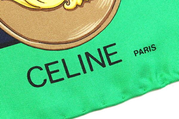 セリーヌスカーフネイビーグリーンシルク100%中古ストールファッション大判ヴィンテージレディースCELINE