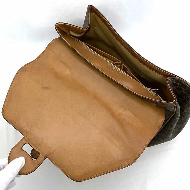 詳細説明:底部の角にスレ、底面やフラップのベルトや金具に傷、ハンドルに黒ずみ汚れ、フラップ内側にシワや汚れ、正面の金具裏側の本体内側部分に一部小さな穴、ハンドルに若干の曲がり癖等ありますが、まだまだお使い頂けるお品物です。