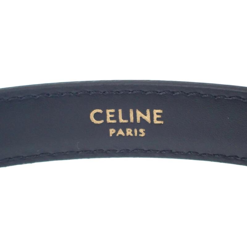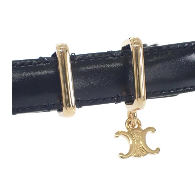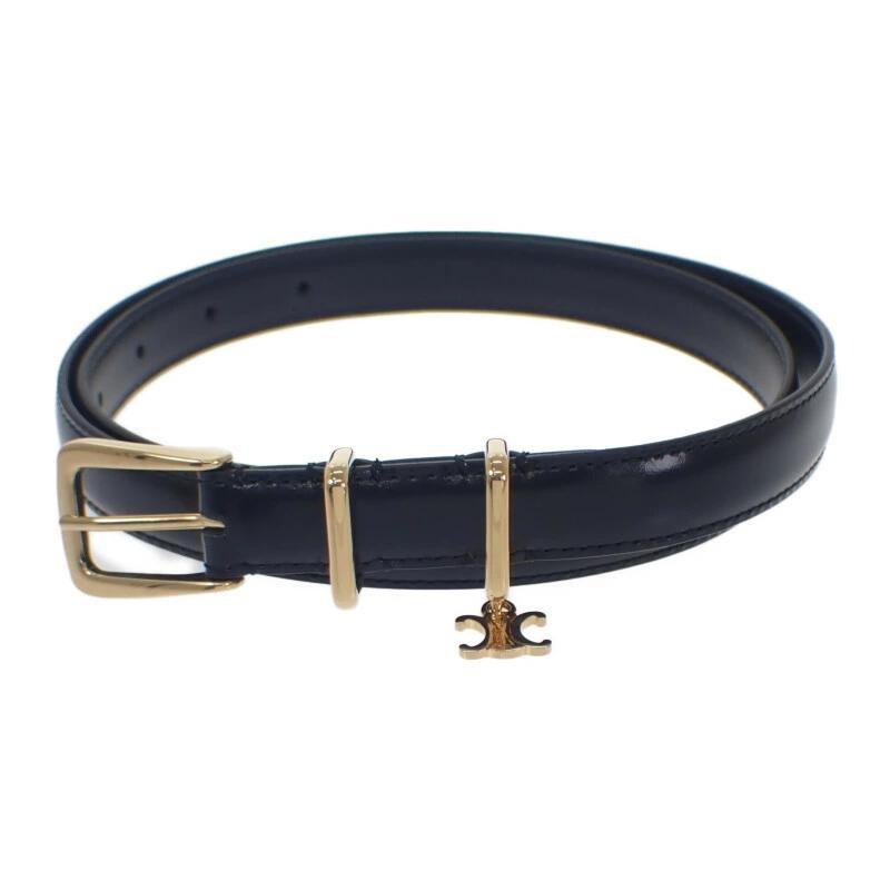 上質なトリヨンレザーに、セリーヌを象徴するトリオンフチャームをあしらい、ブラックのしなやかなレザーとゴールド金具のコントラストが、洗練された印象を放ちます。上品な細身のシルエットがウエストラインを美しく演出し、ドレスにもパンツにもマッチするエレガントな逸品です。