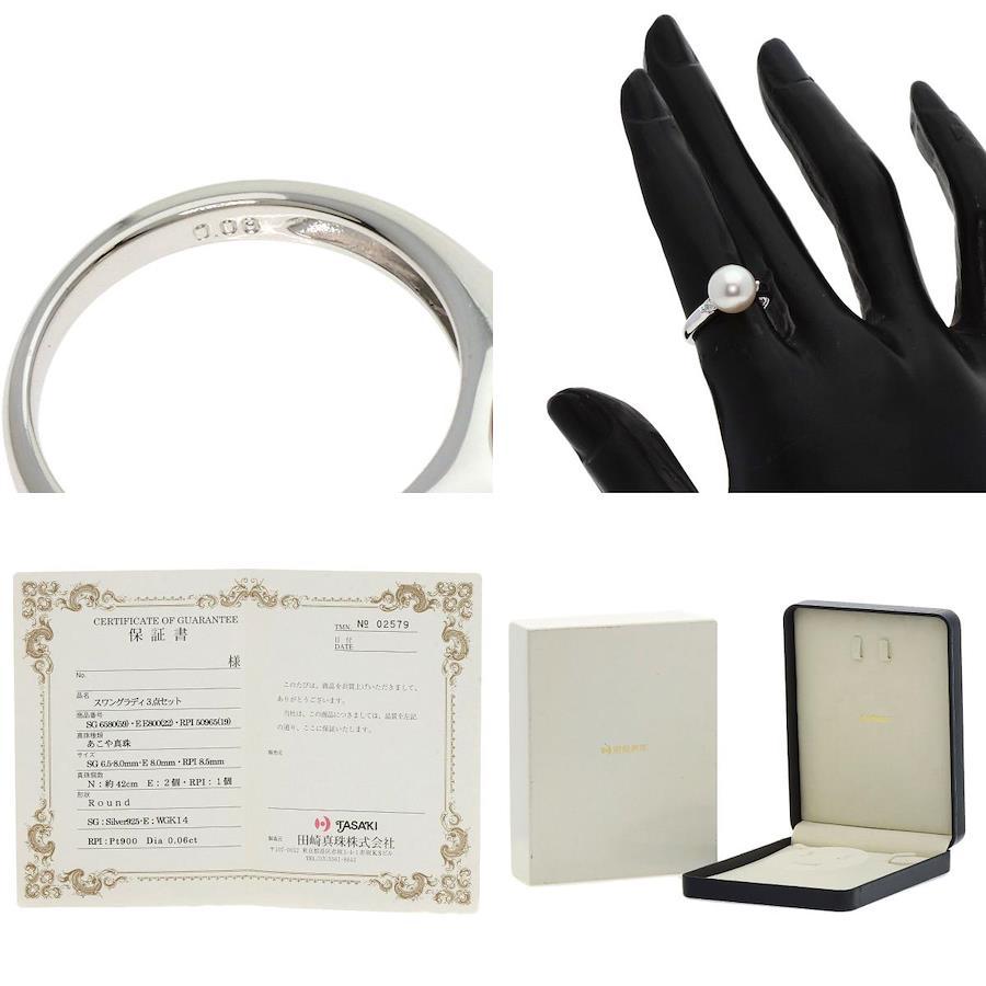 指輪の素材はPT900、リングサイズ約8号、パール約8.7mm、FD 0.06ct。イヤリングの素材はK14WG、パールサイズ8.0mm。
