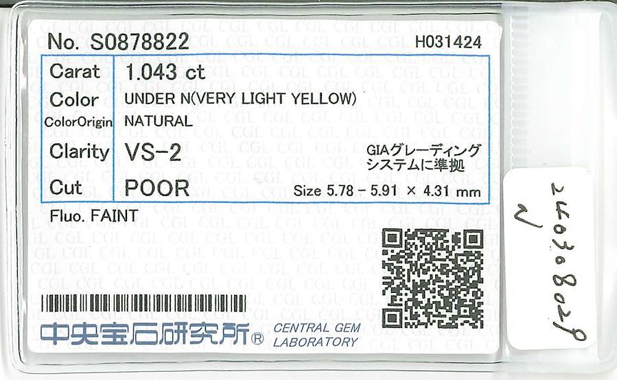 状態:【商品状態】金属部分に微細な小キズ、薄スレがありますが、目につくものではありません。【石の評価】ダイヤモンドの4Cは画像をご確認ください。カラット:1.043ct、カラー:UNDERN(VERYLIGHTYELLOW)、クラリティ:VS-2、カット:POOR
