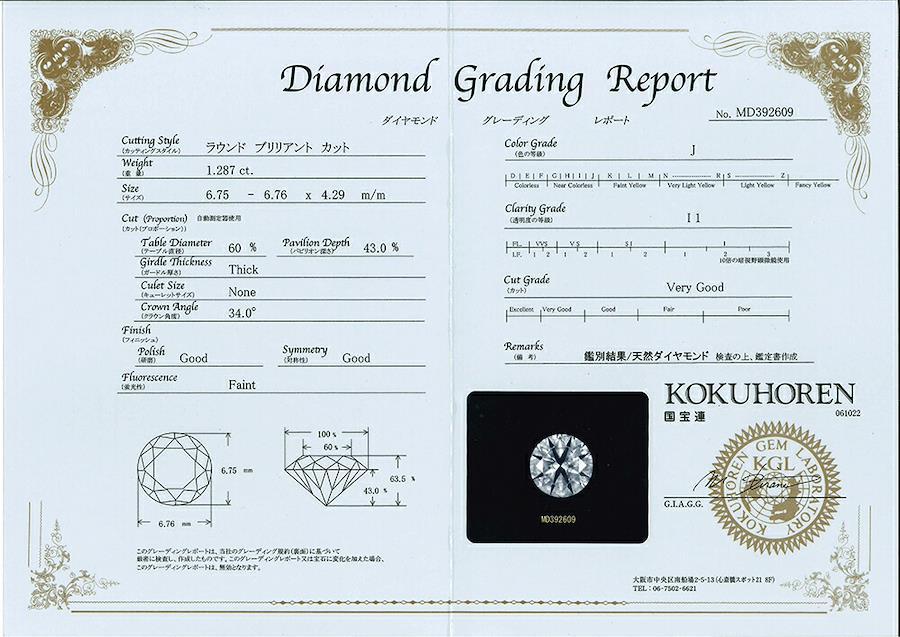 石目:1.287刻印(ダイヤモンド1石1.287ct)クラリティ:I1カラー:Jカット:ベリーグッド