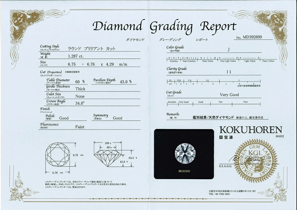 | 石目 | 1.287刻印 (ダイヤモンド 1石 1.287ct) クラリティ:I1 カラー:J カット:ベリーグッド |