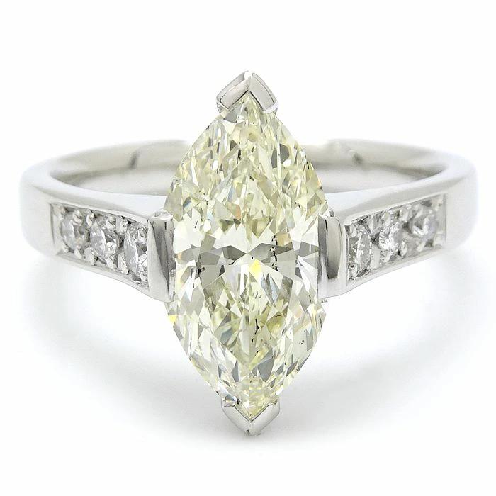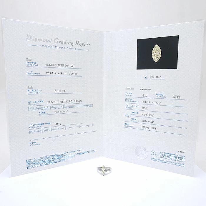 | | 重量 | 7.6g | | 付属品 | 鑑定書(中央宝石研究所発行) | | 備考 | イエローダイヤモンド 2.128ct UNDERN.SI1 マーキスカット ダイヤモンド0.177ct