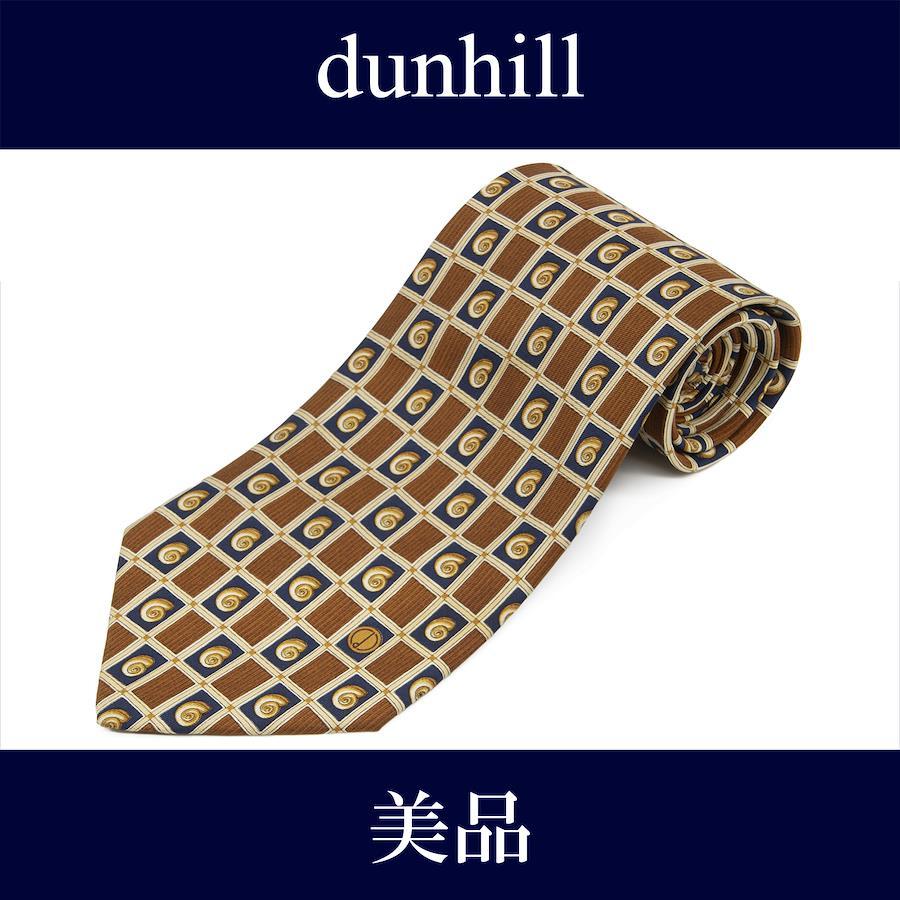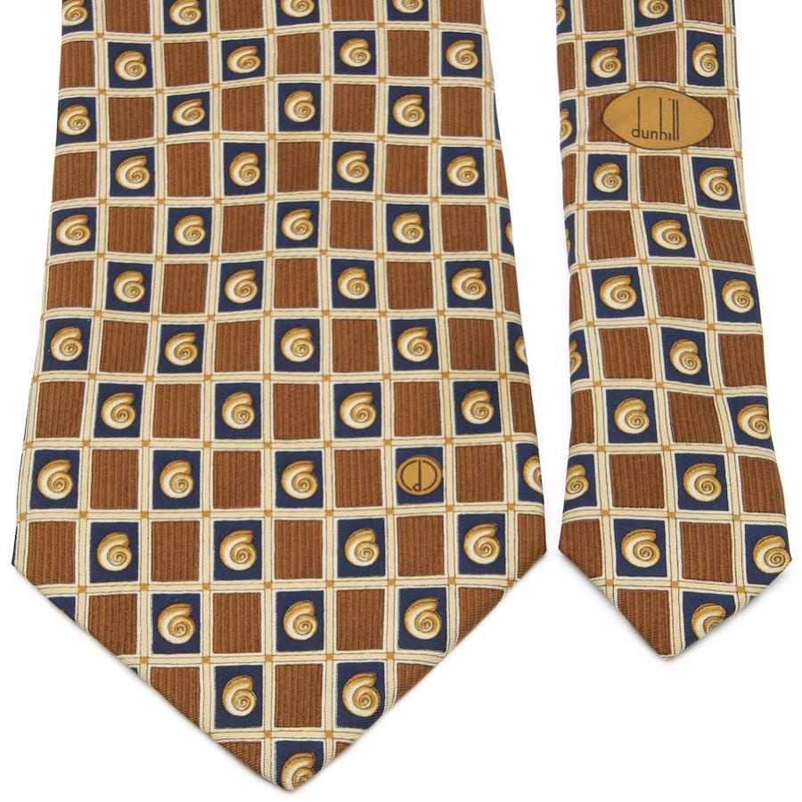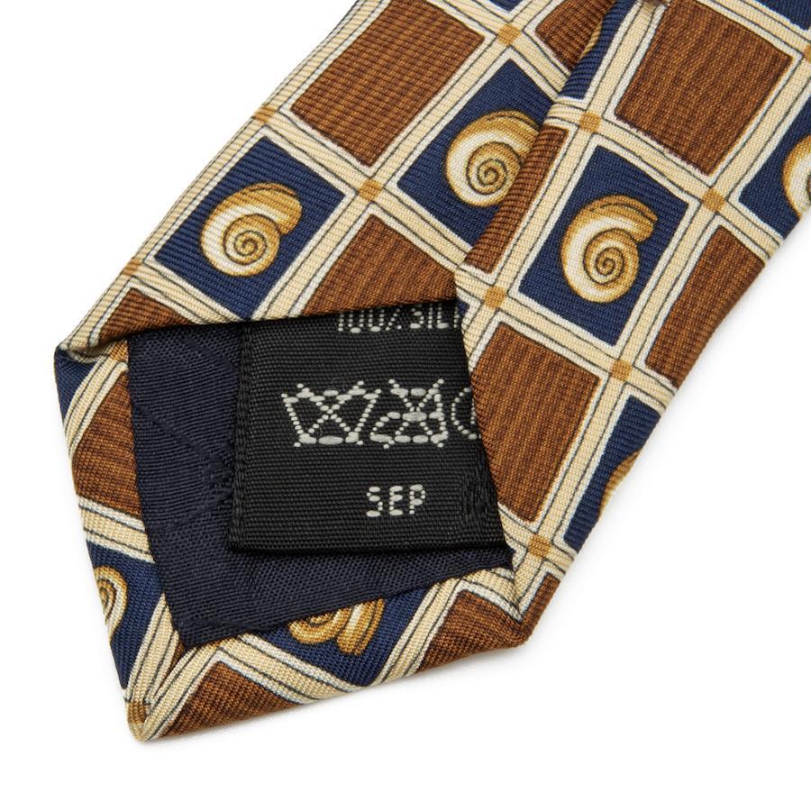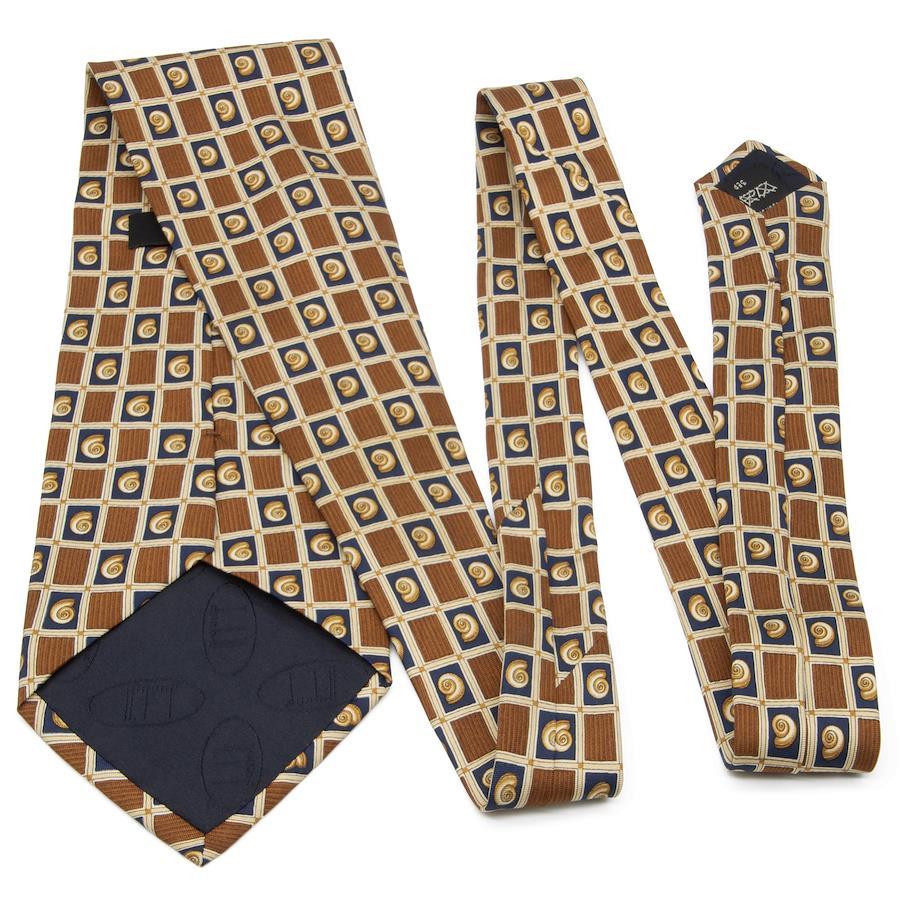 こちらのネクタイは、ブラウンを基調とした生地に、ネイビーブルーとベージュの色彩で表現された四角いマークとかたつむり、巻貝の総柄が全面に広がり、おしゃれな印象を与えます。