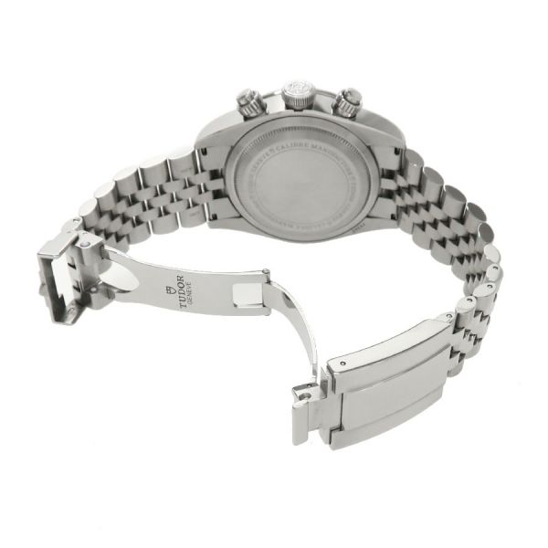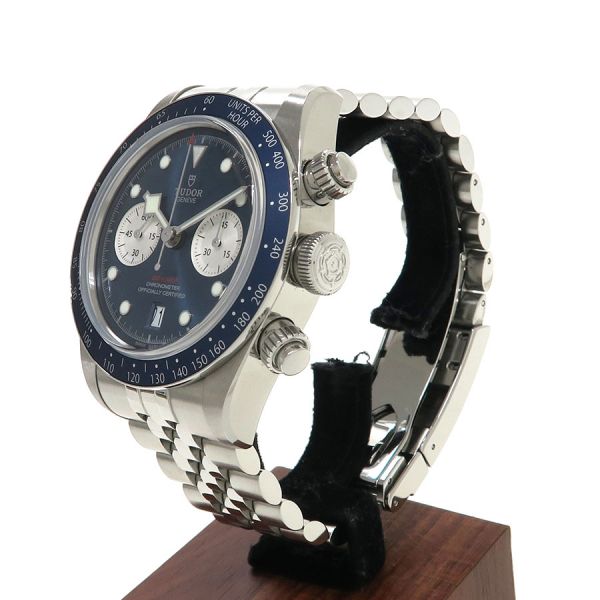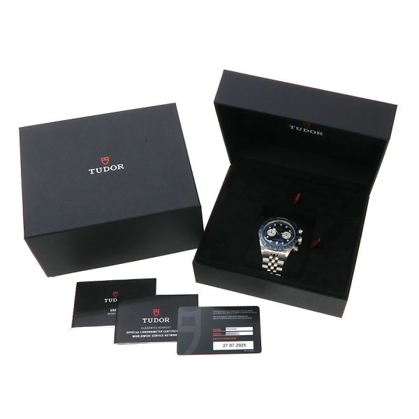 「ブラックベイ クロノ79360B」が入荷しました。鮮やかなブルーフェイスにシルバーインダイヤルの組合せです。ブレスレットの側面には凸リベットが存在しヴィンテージテイストを感じさせるデザインです。ムーブメントの「Cal.MT5813」はブライトリングの自社製ムーブメント「B01」がベースになっており、スイス公式クロノメーター検査協会(COSC)認定と、約70時間のロングパワーリザーブを備え、高い精度と実用性を誇ります。保証書購入日付が2025年7月になっておりますので当社ではメンテナンスを行っておりません。ケースサイドに擦れ、裏蓋に擦れ、バックルに擦れがございます。チューダーの人気モデル ブラックベイをお見逃し無く。