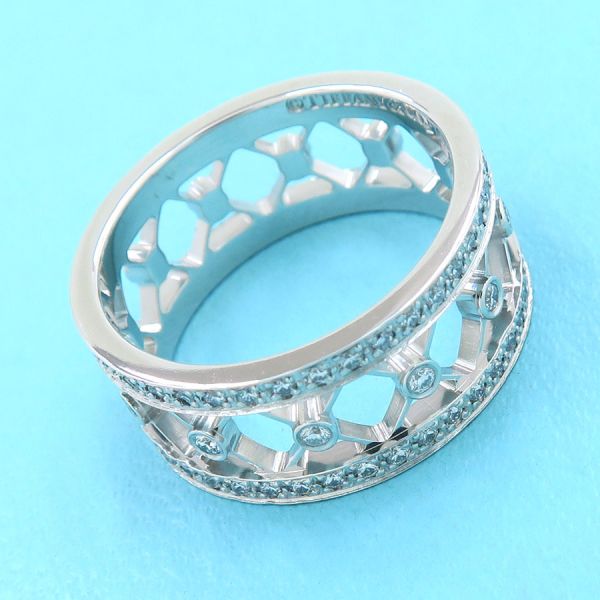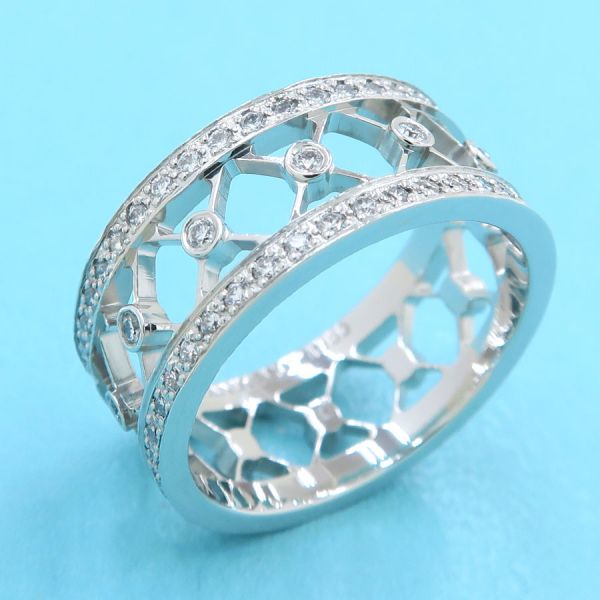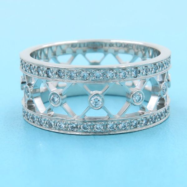 ティファニー、ヴォアールダイヤリングが入荷しました。細かなデザインとダイヤモンドが全周にわたってセッティングされ、とてもオシャレなリングとなっております。 幅広のデザインとなりますが、オープンワークになっておりますので、重たい印象はなくオシャレに身に着けることができます。 どこかエキゾチックな雰囲気を醸し出し、指元で映える素敵なリングとなりますので、是非この機会をお見逃しなく。