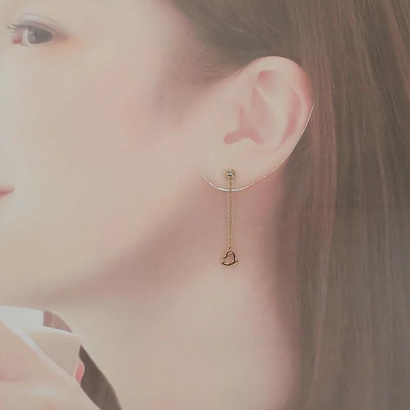 ブリリアントカットが施されたダイヤモンドに、オープンハートモチーフが揺れるさまが目を惹きます。