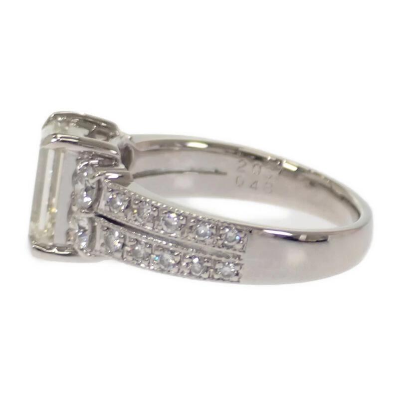 中央に輝く2カラット以上のスクエアカットダイヤモンドが、ゴージャスな存在感を放つデザインリングです。