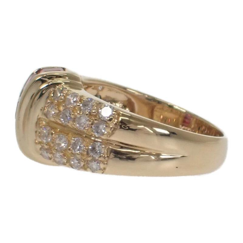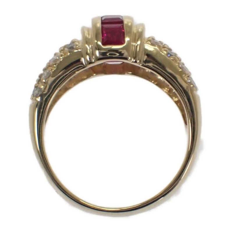 フロントにはスクエアカットされたルビーが配され、サイドにはラウンドブリリアンカットされたダイヤモンドが魅力を引き立ててくれます。