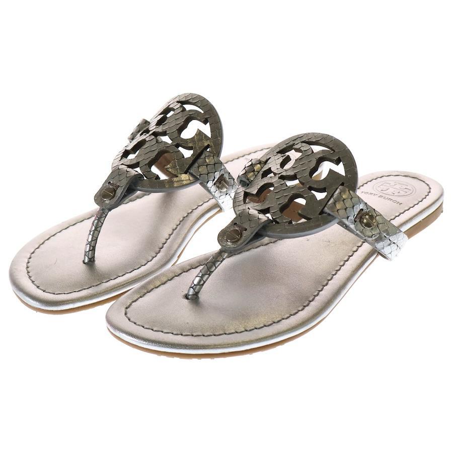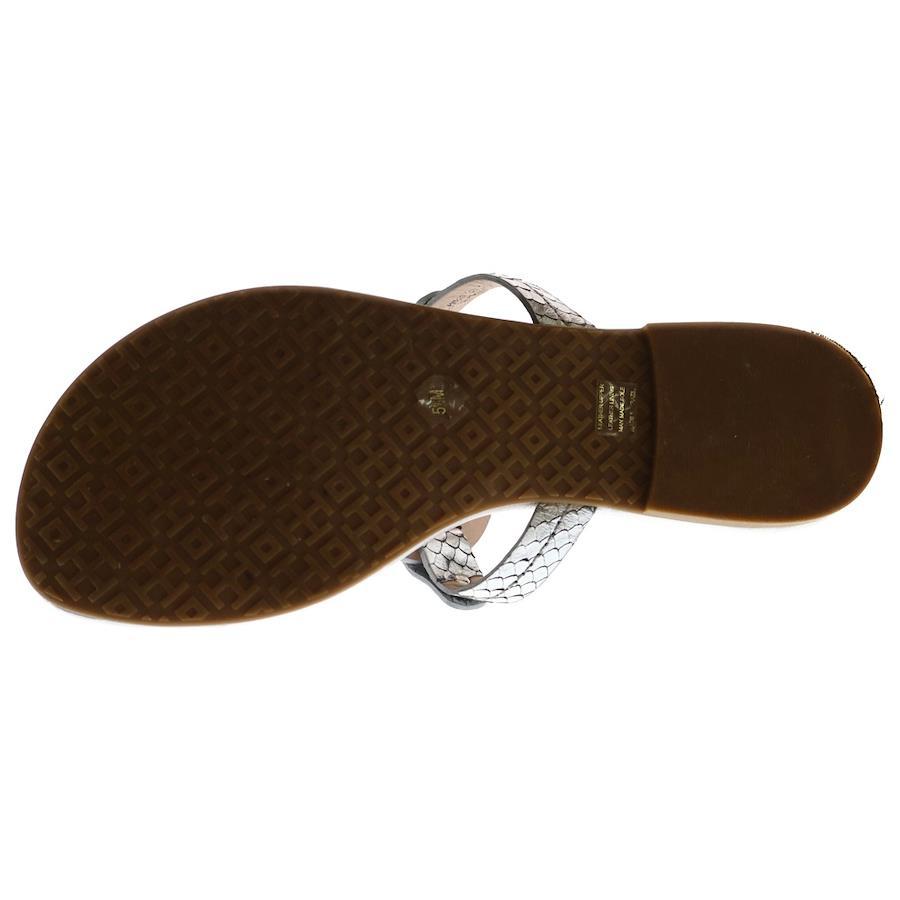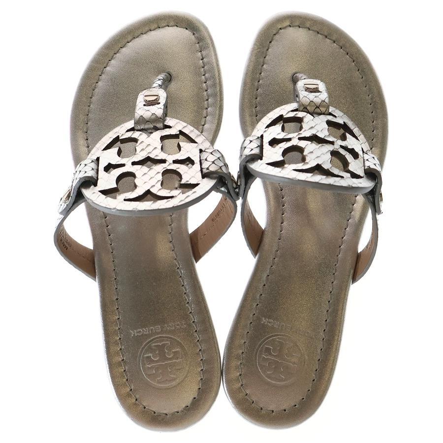[モデル]ロゴ レザー パイソン フラットサンダル シルバー レディース 〇