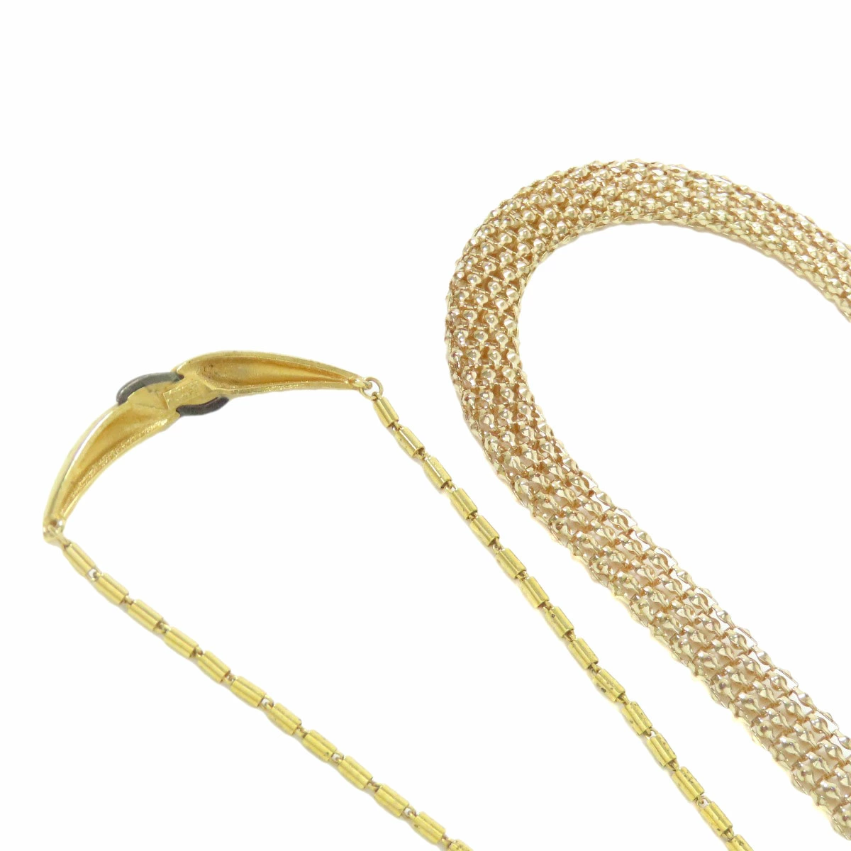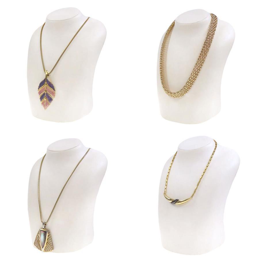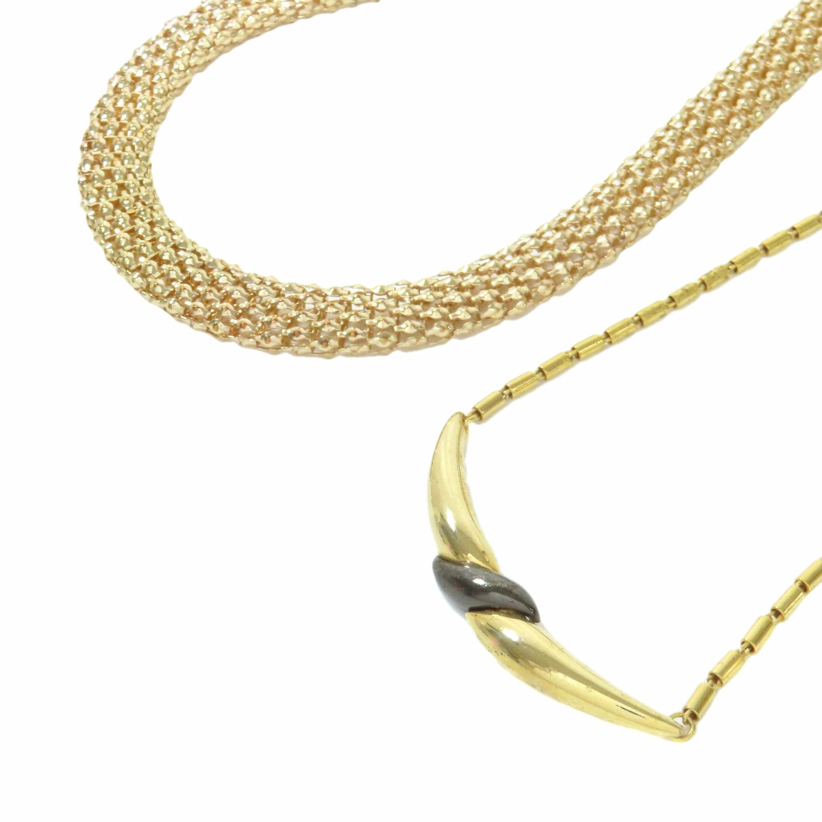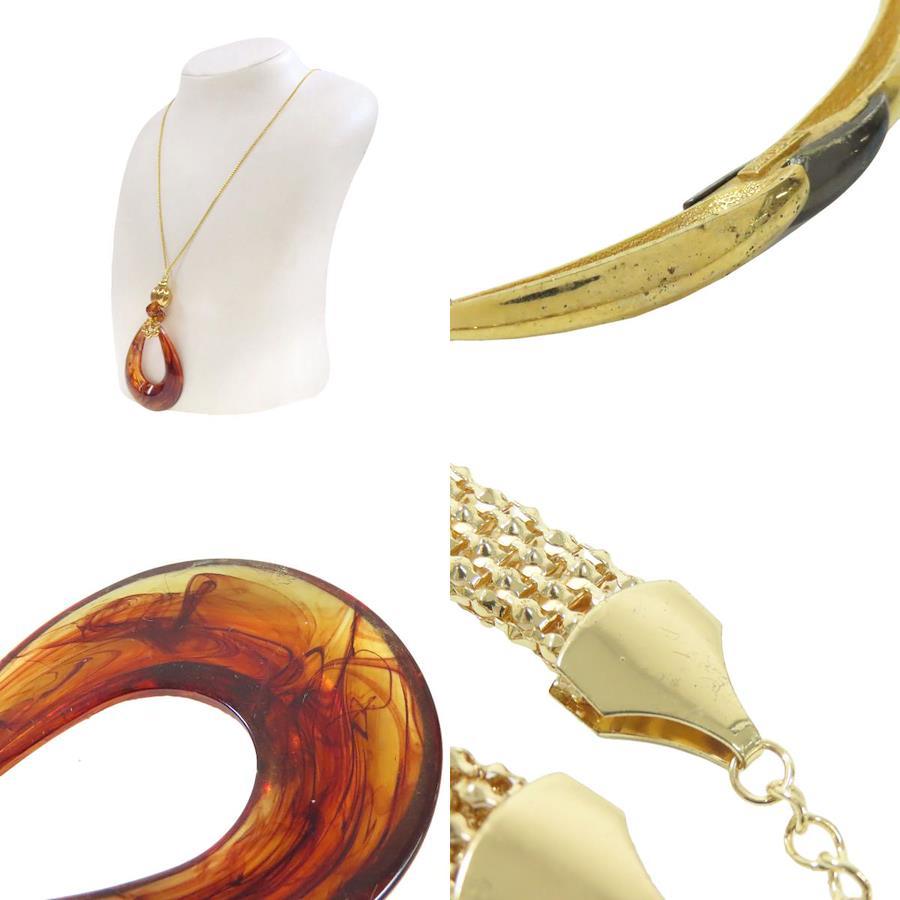 ブラウントップネックレスチェーン長さ約70cm、チェーン幅約1mm、重さ約12.7g。三日月型ネックレスチェーン長さ約約47-41cm、トップの大きさ約165x16mm、チェーン幅約2mm、重さ約21.2g。グレートップネックレスチェーン長さ約68cm、約57x46x5mm、チェーン幅約2mm、重さ約29.1g。ゴールド編み込み風ネックレスチェーン長さ約45-51.5cm、チェーン幅約13mm、重さ約26.1g。