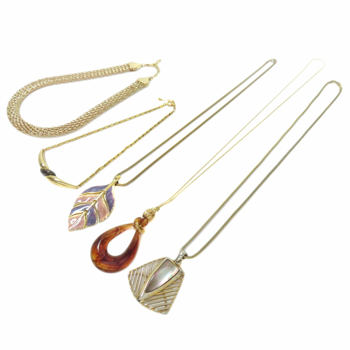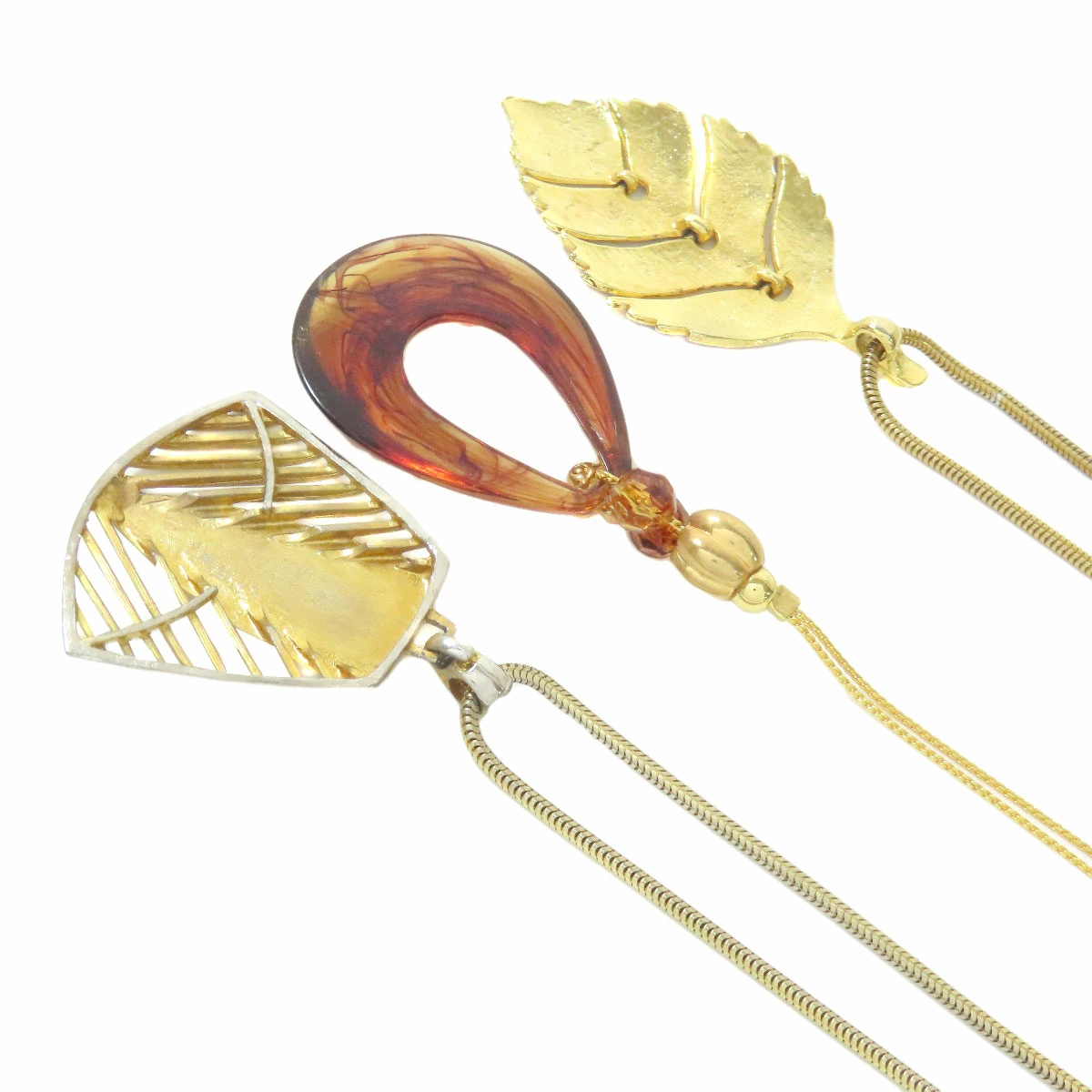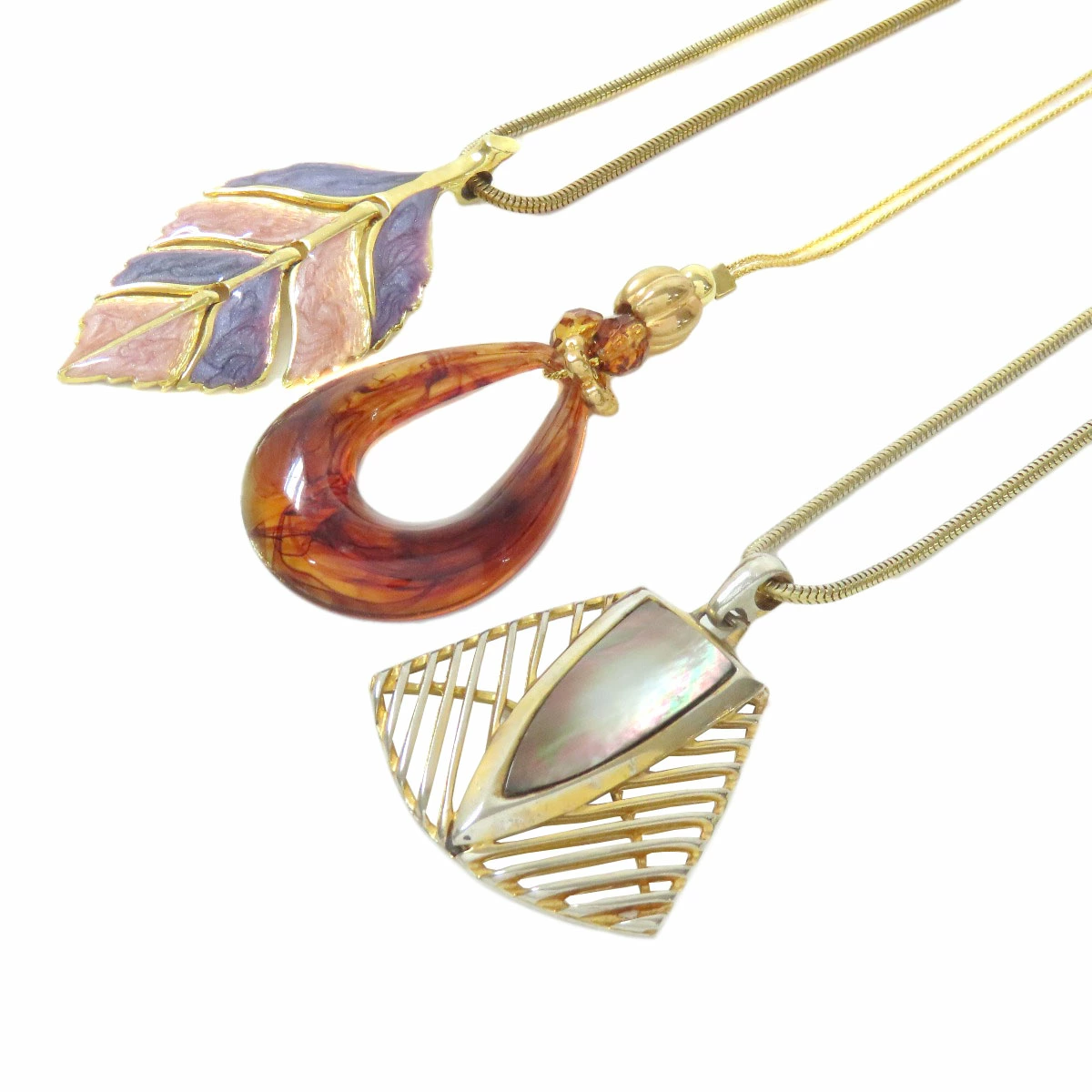 ブラウントップネックレスチェーン長さ約70cm、チェーン幅約1mm、重さ約12.7g。三日月型ネックレスチェーン長さ約約47-41cm、トップの大きさ約165x16mm、チェーン幅約2mm、重さ約21.2g。グレートップネックレスチェーン長さ約68cm、約57x46x5mm、チェーン幅約2mm、重さ約29.1g。ゴールド編み込み風ネックレスチェーン長さ約45-51.5cm、チェーン幅約13mm、重さ約26.1g。