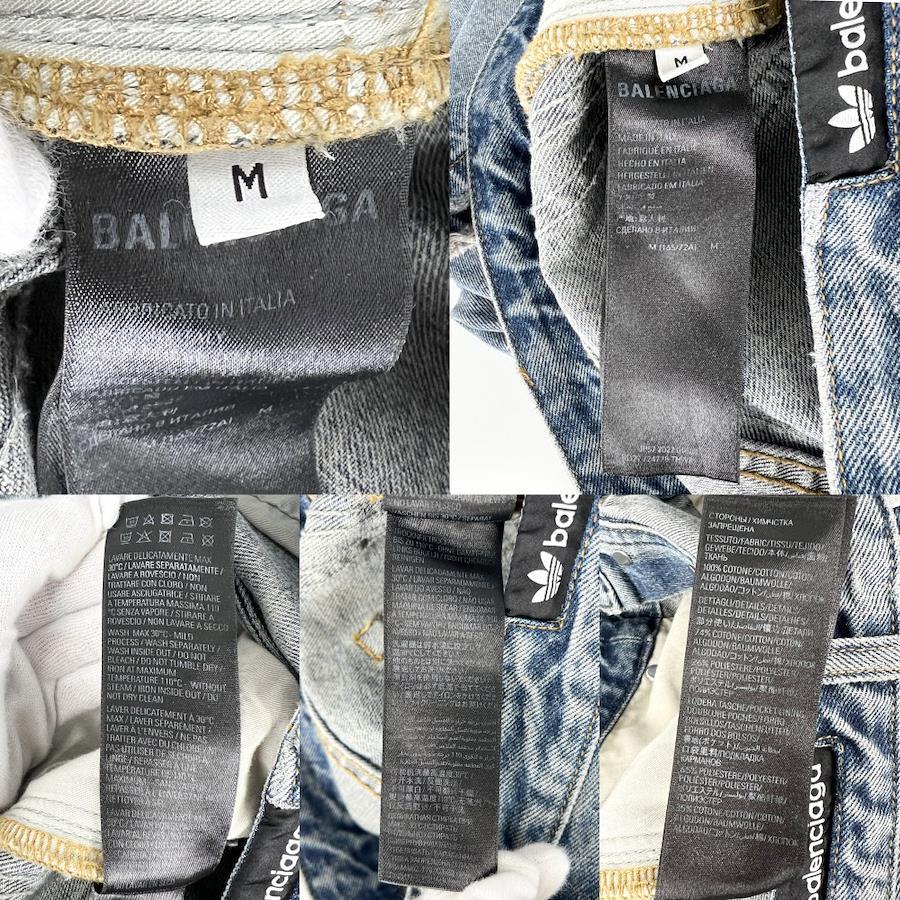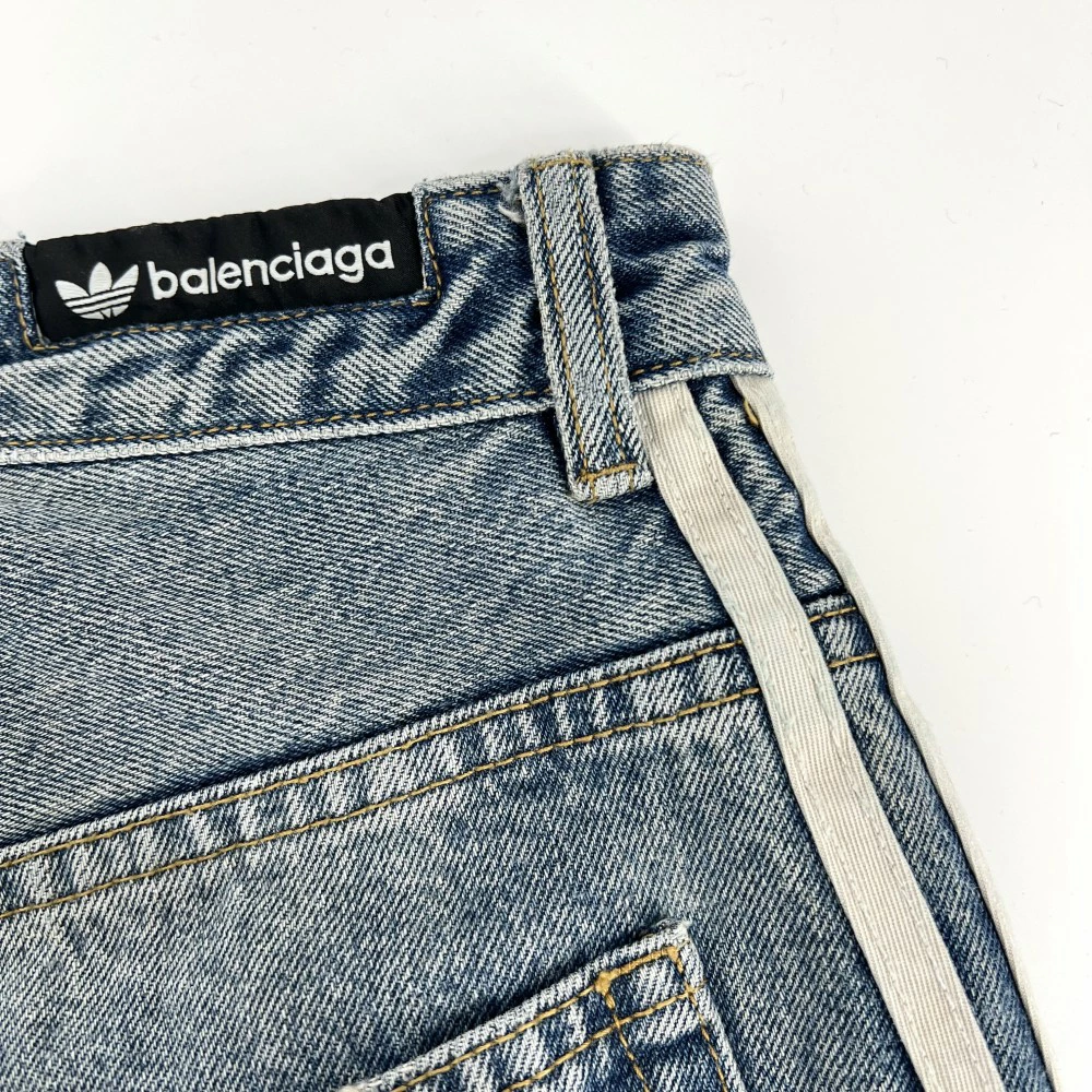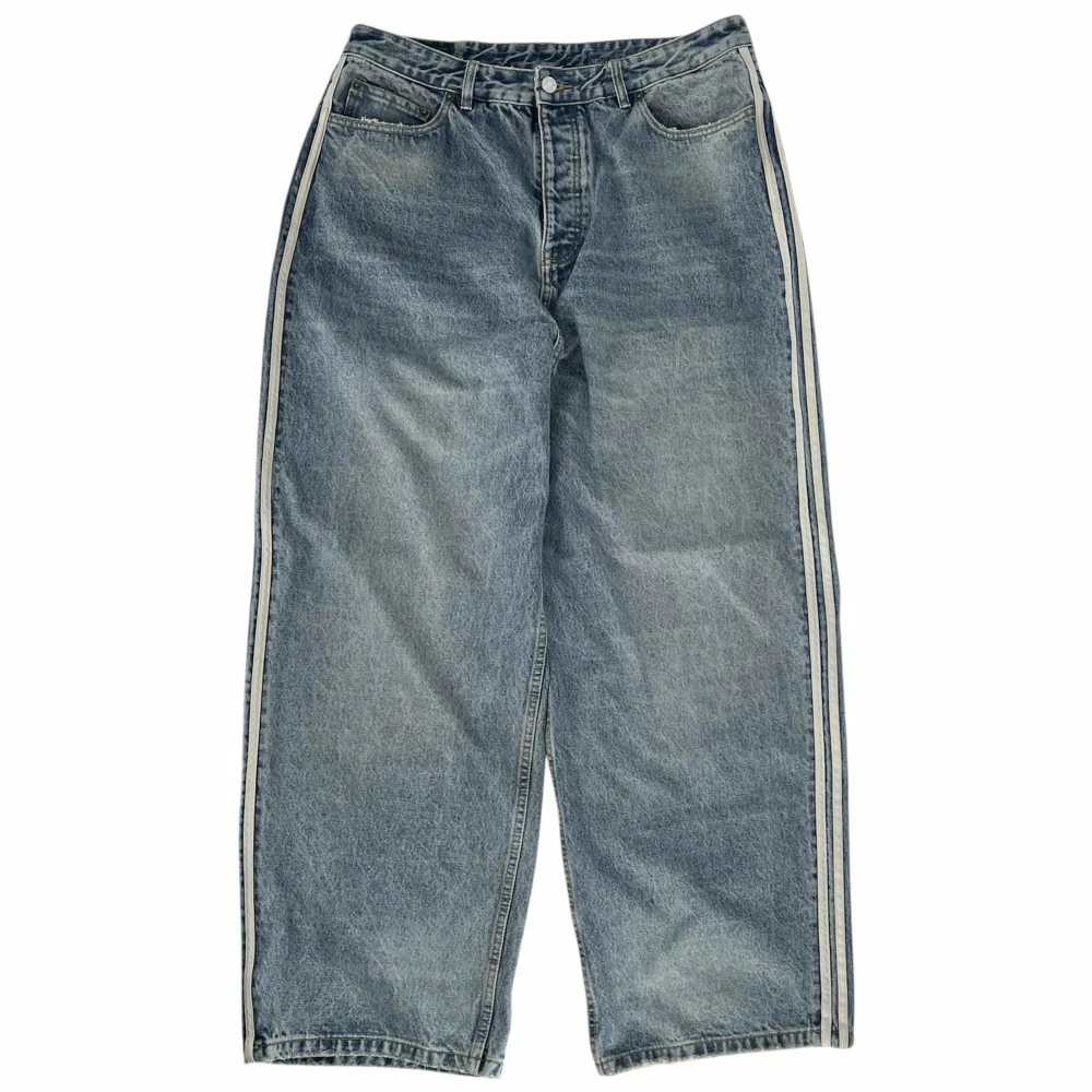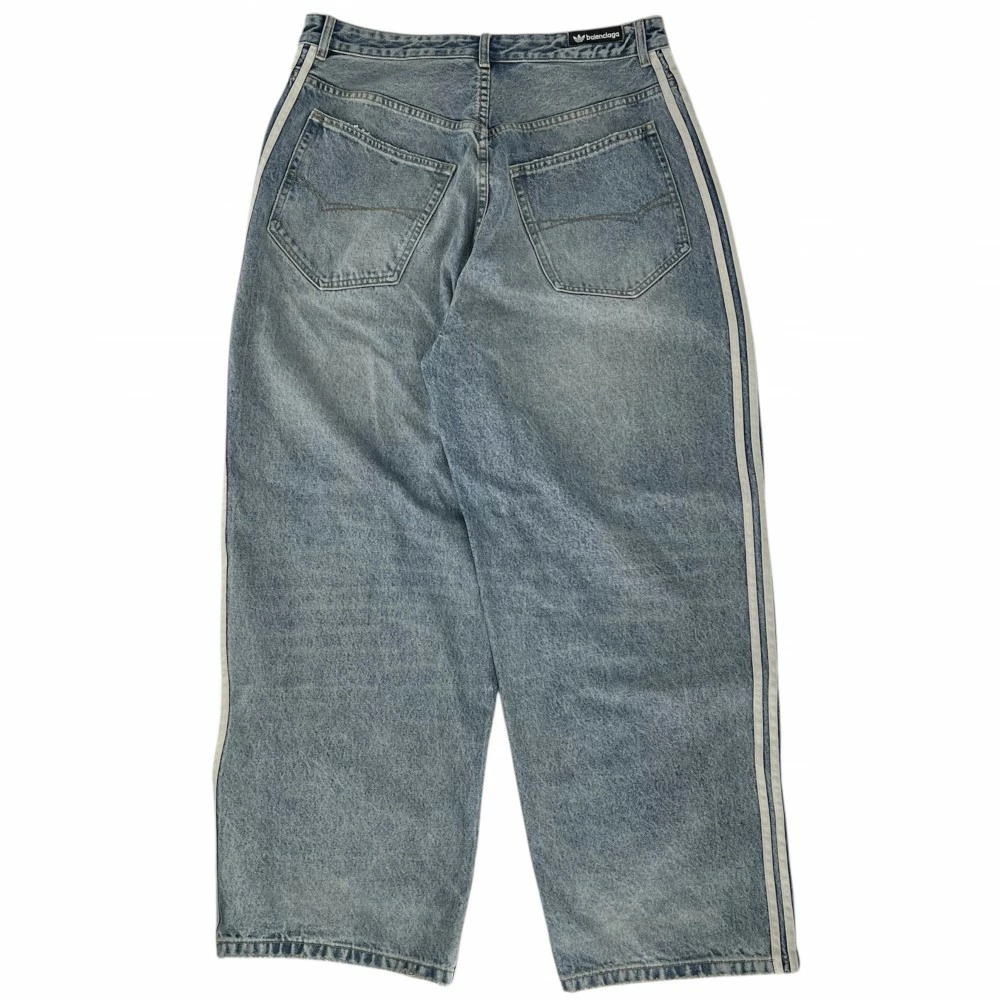 Pre-owned Balenciaga men's denim pants with side stripes and baggy adidas logo. Straight-leg pants, size M (724778), indigo with silver hardware and cotton. Perfect for all seasons.
