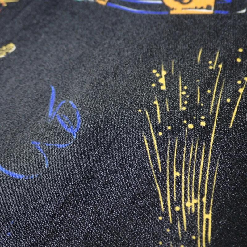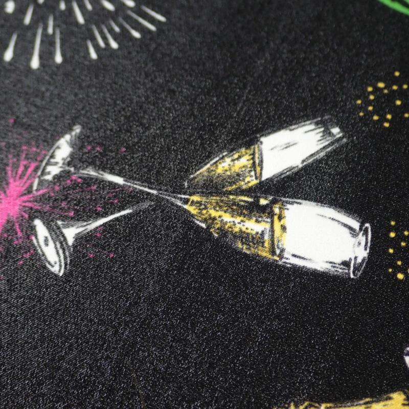 シャンパンボトルやグラス、花火などの色鮮やかなモチーフが散りばめられた、華やかで遊び心のあるアイテム。