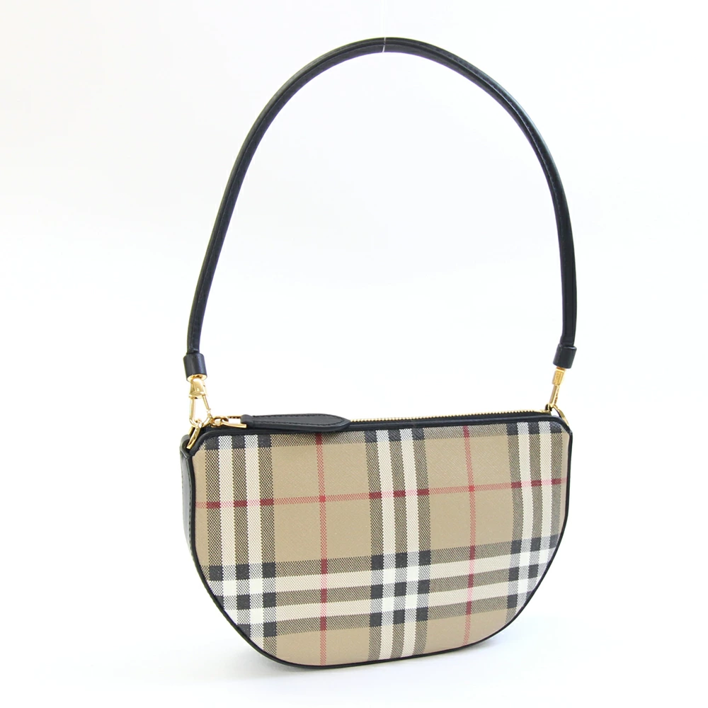 Pre-owned Burberry Olympia Pouch (8058006) in beige, black, PVC, and leather. This semi-shoulder clutch bag features a check pattern. Perfect for women.