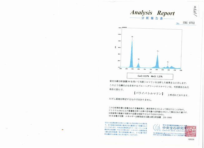 [鑑定書・鑑別書]鑑別書(ケースはありません。)中央宝石研究所天然トルマリン成分分析表